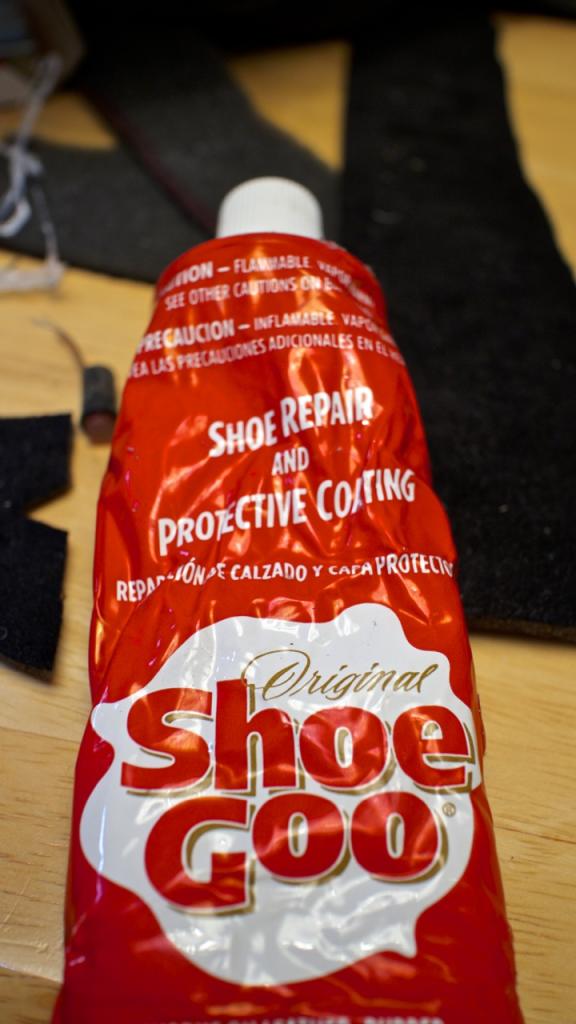So I globbed a bunch of this stuff on the there and then dragged the glue flush with a razor blade. Shoe Goo is great to use for panels that flex like this since it is, well, highly flexible! Plus it is super durable too. I used to use it on all my climbing shoes when I'd blow a heel or toe. Never failed once.