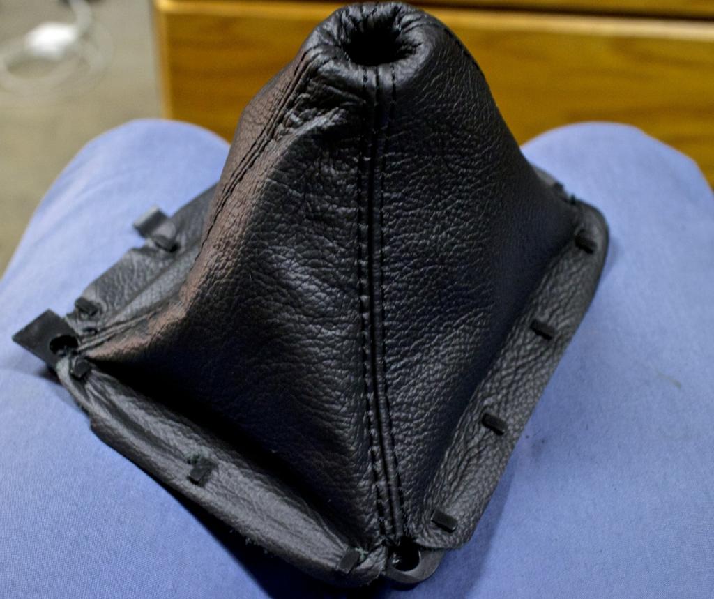 First remove the trim ring on the old shift boot. Then scrape off the old glue and apply some super 77 spray adhesive to the TRIM RING ONLY. If you try to put it on the leather it will most like get some overspray on it. You could probably just use some super glue but I'm a huge fan of Super 77 spray adhesive.