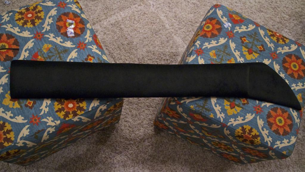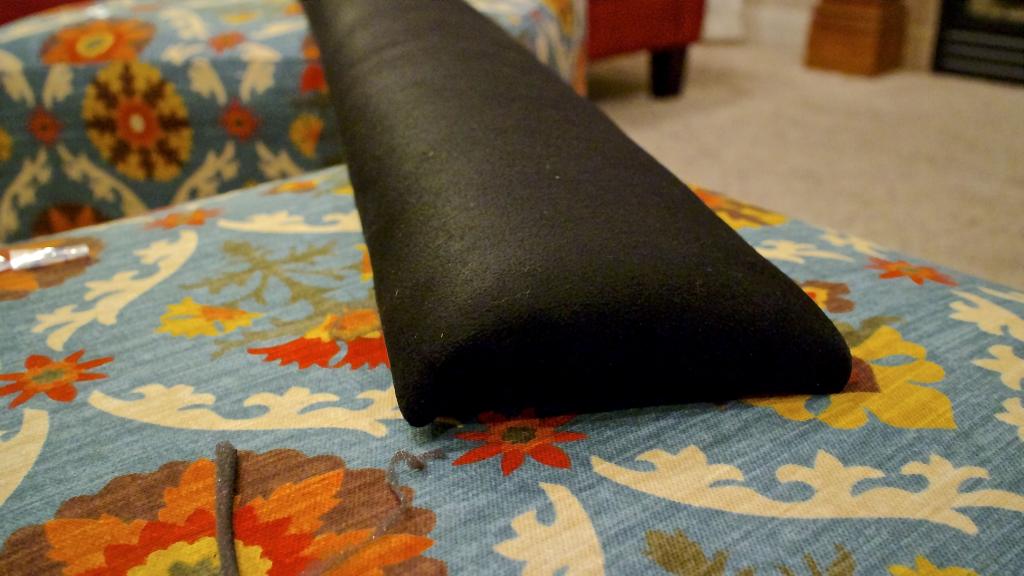 Oof, this is much harder when you are using adhesive. I tried staples but the plastic was too thin. Let's just say, you better get the fabric on perfect the first go around. I added a tiny amount of padding for comfort. thicker on the top and then gradually thinner as it goes to the bottom. It has a couple bumps here and there, but I'm going to go over it with my small rolling pin and a heat gun to compress them for a perfect roundness.