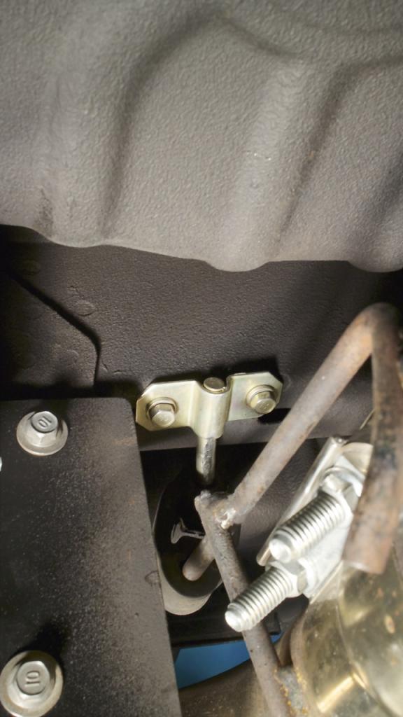 So I grabbed an extra exhaust hanger from the other car and hammered it flat, drilled a couple M8x1.25 holes and a class 8 bolts with a compression washer and put red loctite on them for security.