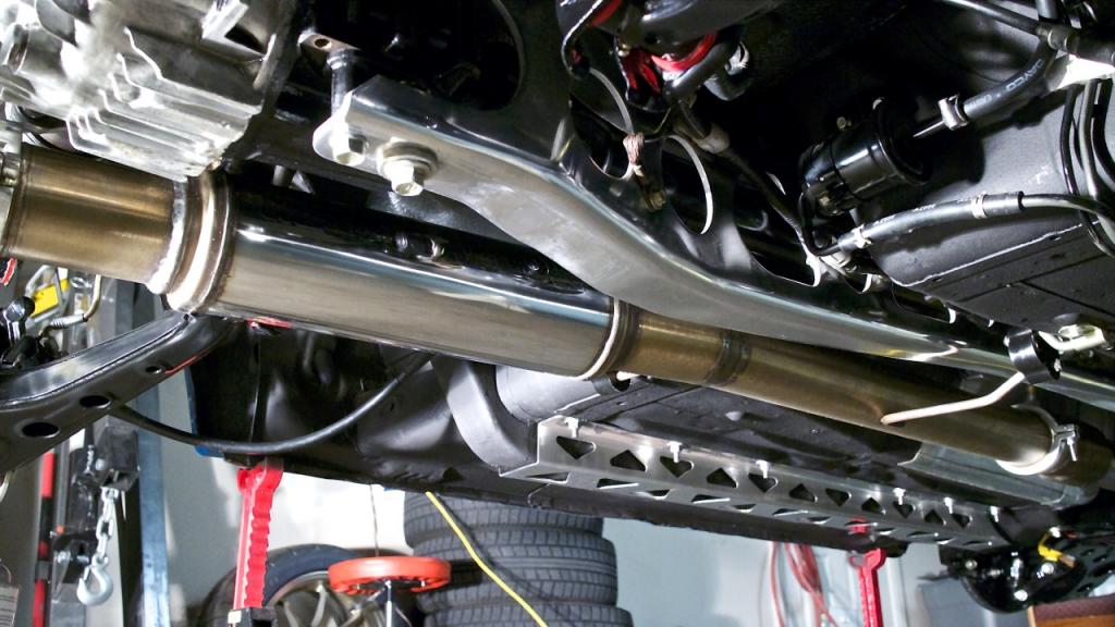 Not done with adjusting it. The right side is pulled in too much but the left side is perfect. I might remove the coupling on the right exhaust pipe and pull it out a little bit for some equilibrium. I've messed with trying to do it with the poly hangers and it just resettles back to its static position after a while.