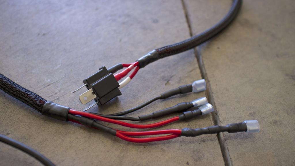 I bought an additional H4 bulb so that I didn't have to splice into the factory connector and make it all ugly looking. The bottom pair of wires are paired to the low beam relay and the high beam has a diode(bottom wire, the little round heat shrinked pustule). The diode makes it so that when you have the low beams on only, the high beams won't come on as well.