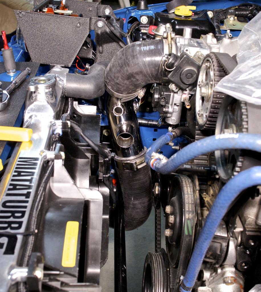 Just a few issues that I want to ask your opinion on though. The throttle body on this car is longer than normal due to the flyin miata adapter and so the piping gets kicked out just a hair too much.