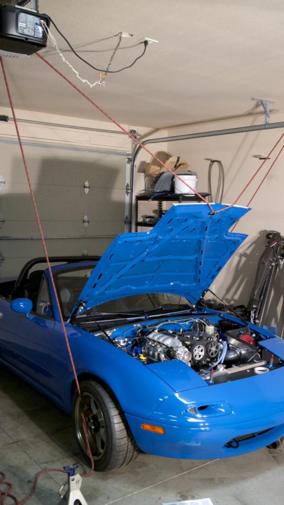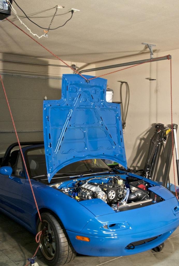 Used my old climbing rope that I had to retire and strung it over the garage door guides. After I got it in position I slowly lowered it until I could angle the hood correctly to slip it on to the brackets.