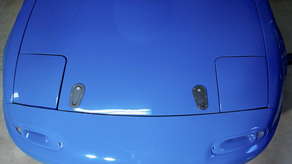 All closed up. Tolerances are very tight. My brackets were off by about 1mm so I had to bend the top of the hood pins very slightly to ensure it would slide in. People who are worried about rattling can rest easy, I have to push down on the hood a little to let the catch pin slide through the vertical pin and after pulling on the hood hard and shaking it there wasn't one MM of movement.