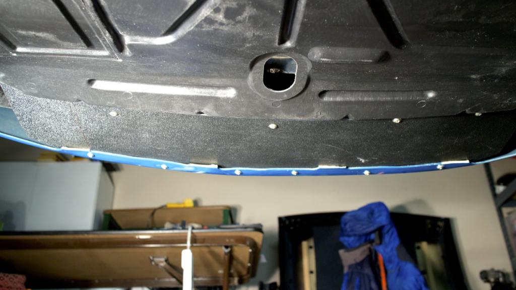 You have to cut through the inner layer of the aluminum so that only the outer hood aluminum is sandwiched between the top and bottom layer. I ran out of dremmel cutting wheels so it isn't a very pretty cut but I'll just put a sticker over the holes later. I also put some blue touch up paint over the cuts and inner layer to church it up a bit.