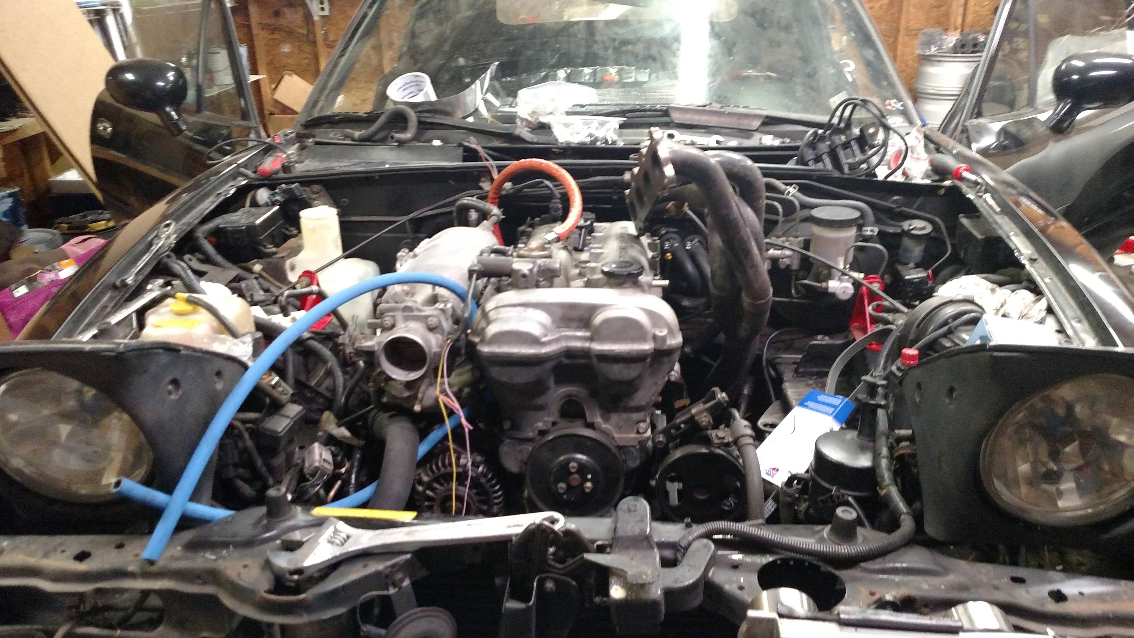 VVT motor and flat top is in. I have done a coolant reroute. I need to install the exhaust section, do all the wiring to NB sensors hook up accessory hoses, install and hook up radiator, hook up fuel lines, and install intake.
