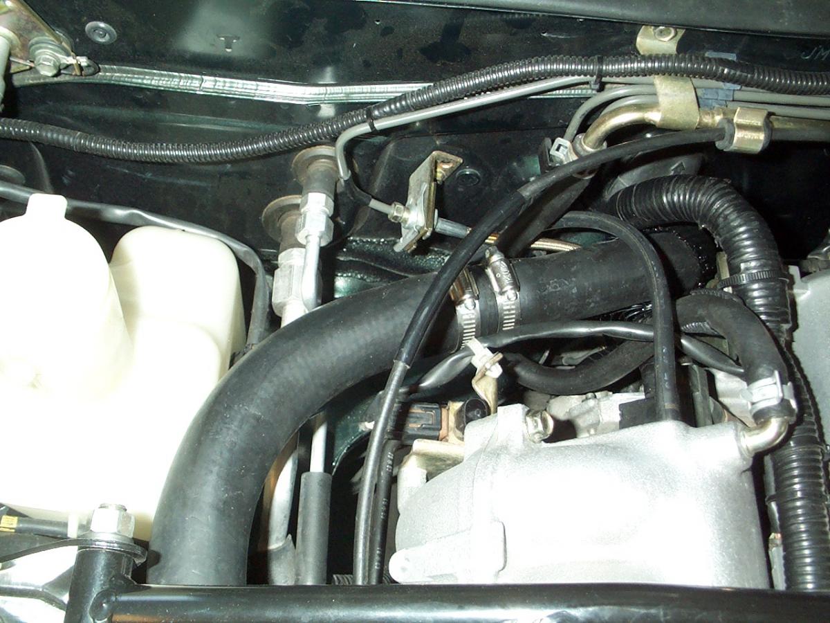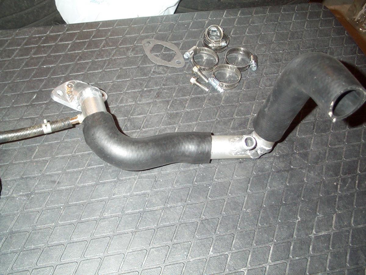 The upper reroute uses the moss spacer, a Kia thermostat cover and a GMC truck water hose.