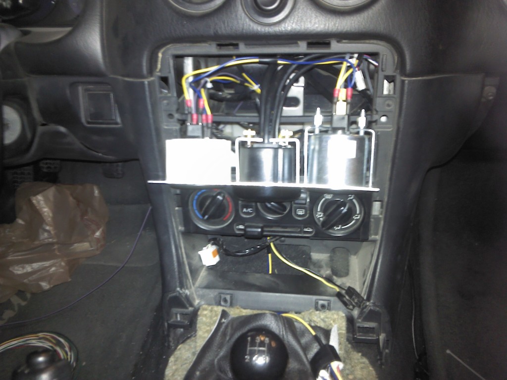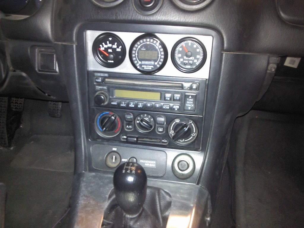 A shot of the gauges on the panel with the wiring and at the bottom on top of the shift boot shows how I tapped into the console connector for IGN ON for switched 12v and the GND wire for the oil temp gauge.