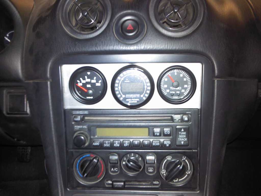 I finally got around to installing the gauge panel and gauges. The panel has a VDO oil temp gauge on the left, the Innovate MTX-L AFR gauge in the center and a VDO boost gauge on the right. The gauge lights are wired into the dash wiring and also use the dimmer.