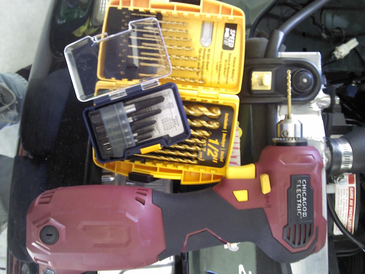 I bought an angle drill from the local HarborFreight. Dewalt titanium drill bits and screw extractors. (The HF drill is total win BTW).