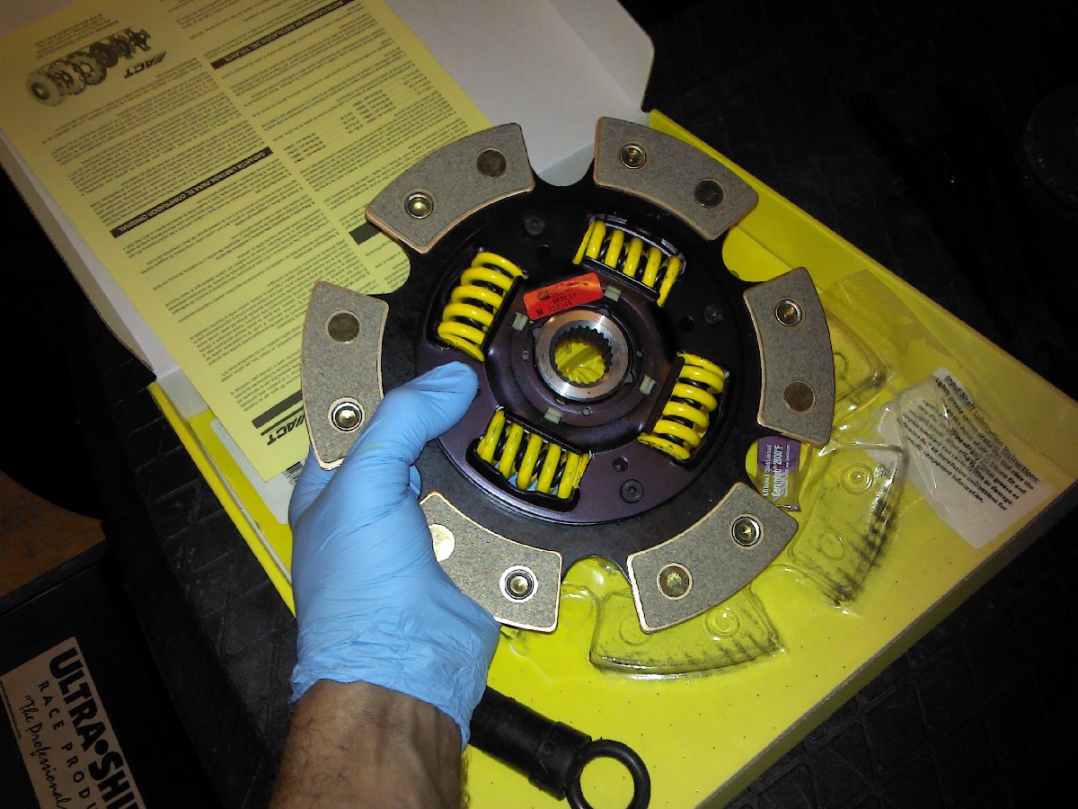 I was using a ACT HD with the ACT street disk. I installed it when I had the supercharger, so it's old. The new ACT sprung 6-puck break in procedure is a few hard slips to lap the surface and then you are good to go.