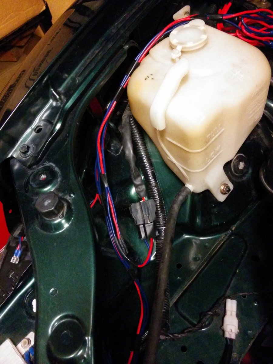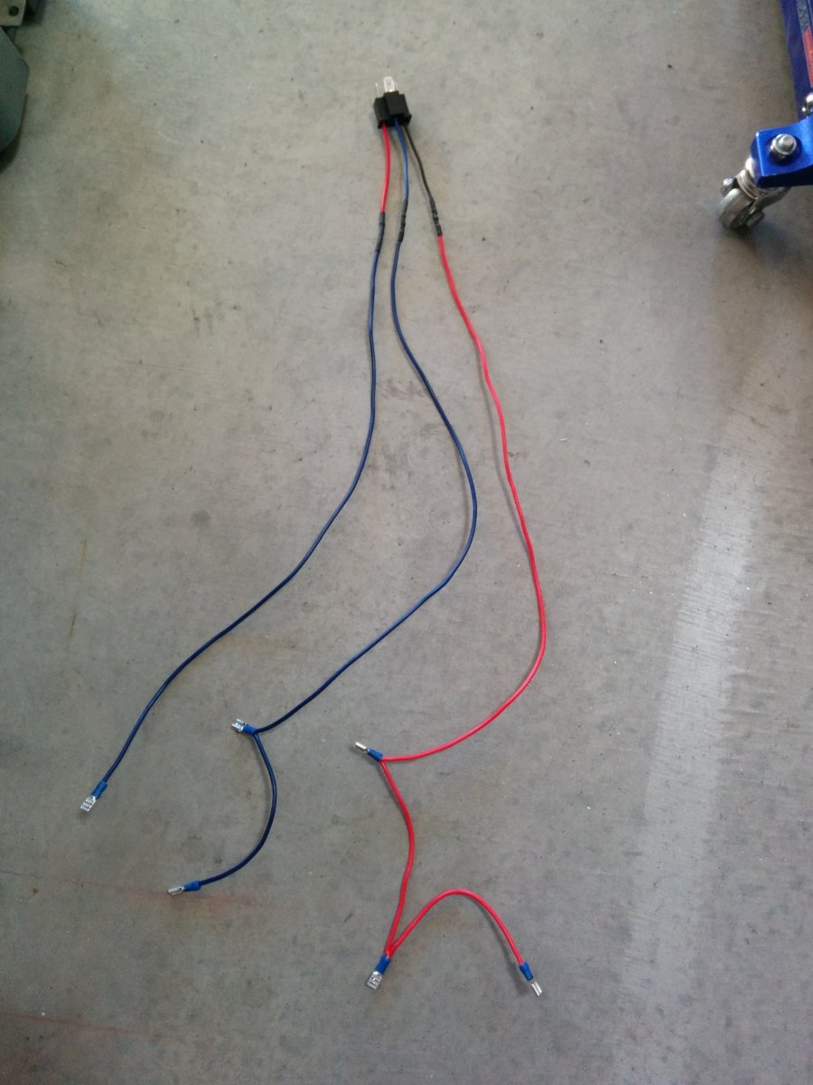 I made a harness that uses the headlight connector wires to activate the relays to switch from low to high beam. I tapped into the engine bay fuse box for power for the headlight harness. The harness allows to have all four lights on when the high beam is selected. The projector lights are the low beam and the inner lights are the high beams.