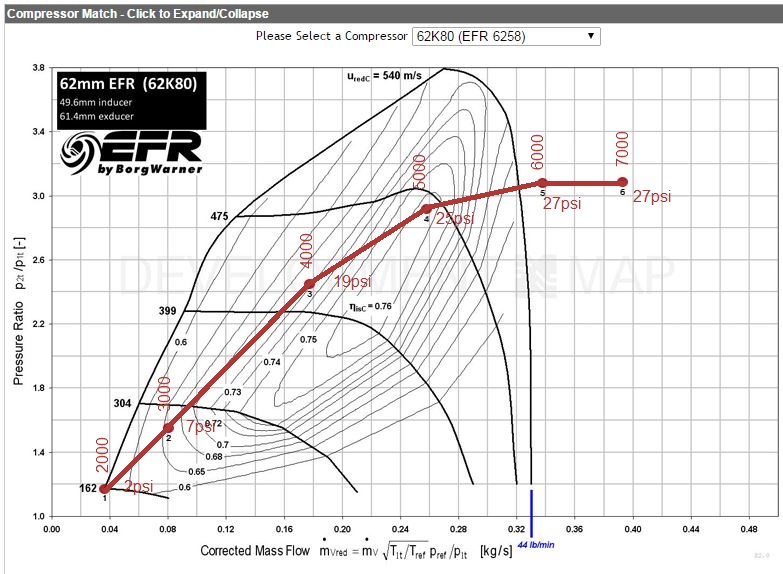 That turbo based on the map can move maximum 44lbs, that's around 440hp. Now you are running that turbo to the **** at those numbers. I can see the car gaining torque at the low end by upping the boost, not sure if that torque will carry over to the upper rpm's for 400hp. 94 Octane it might see 370whp, potentially over-spinning the turbo. Not sure if I would drive around like that on a daily basis. You are sitting on the edge of bad surge!