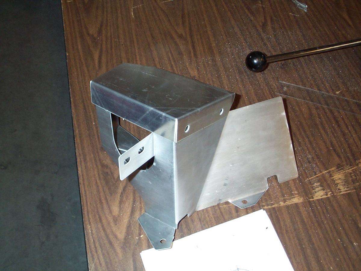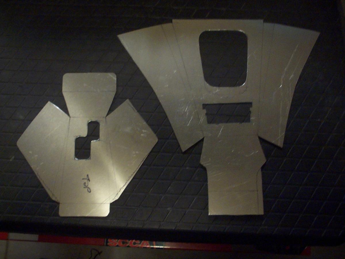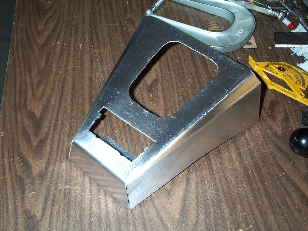Here is my custom aluminum center console. I made the templates out of cardboard, transferred them to aluminum sheet, cut them out then bent them into shape.