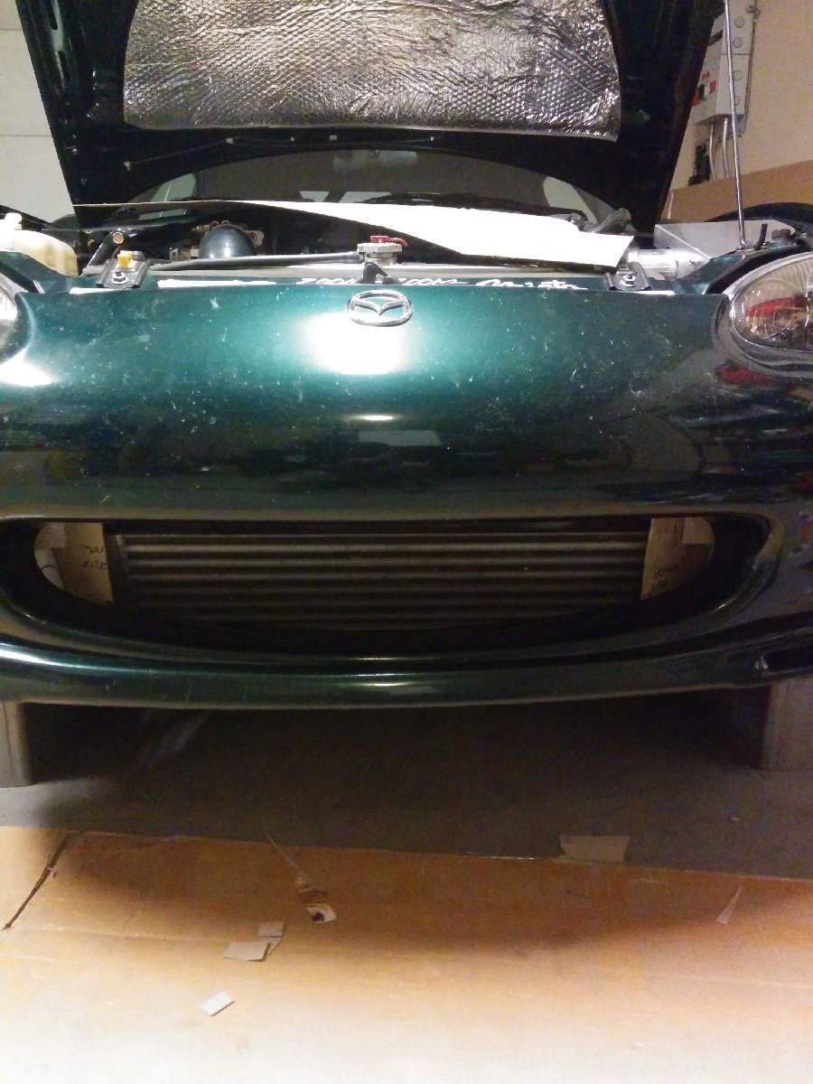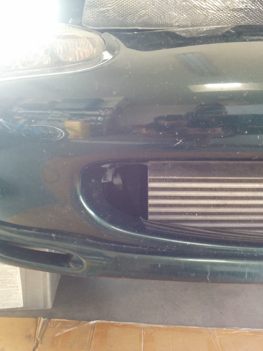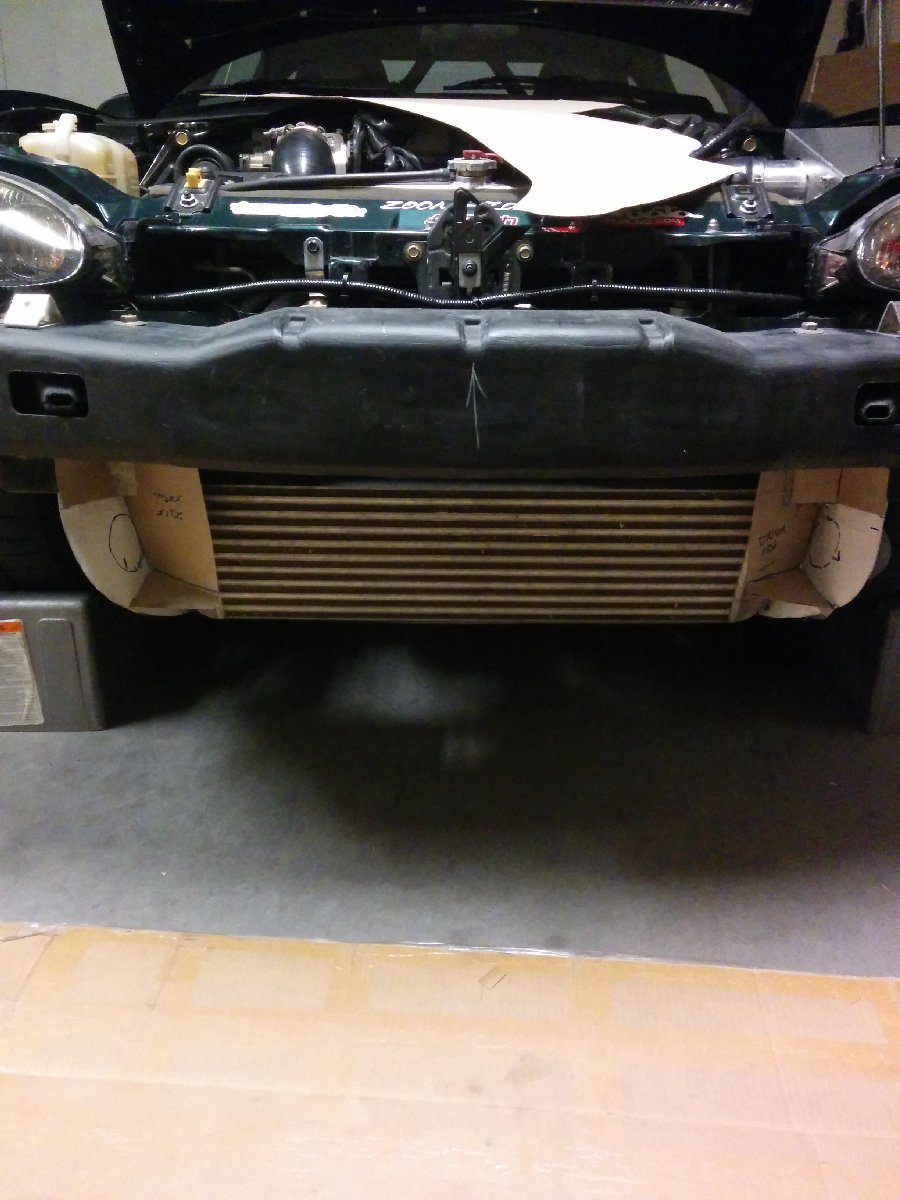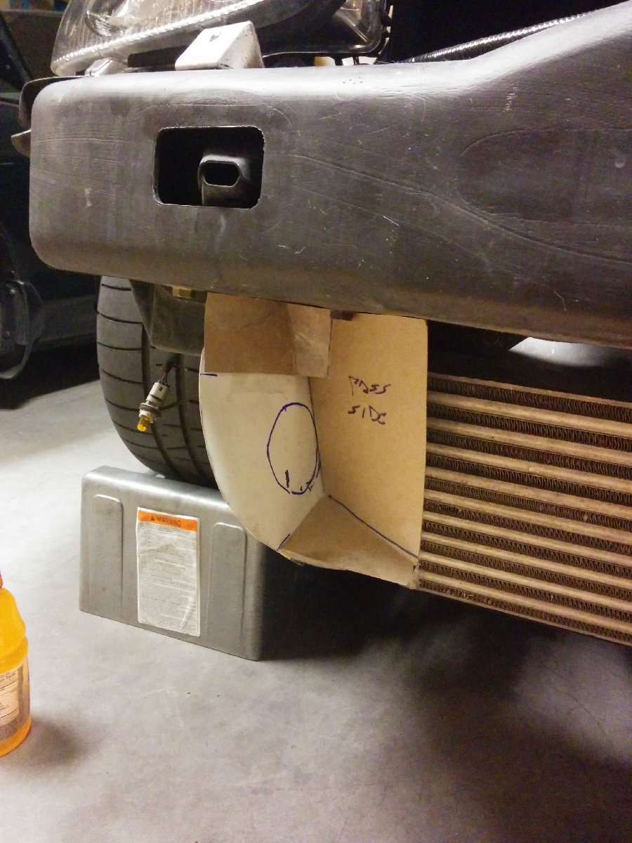 I bought flanges from AircraftSpruce and made air ducts in the mouth of the bumper. I integrated them into the intercooler ducting that I had previously made. I first made cardboard templates and then transferred them to aluminum sheet and then riveted them in and painted them black.