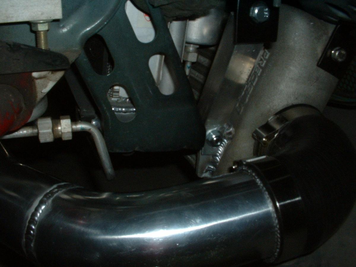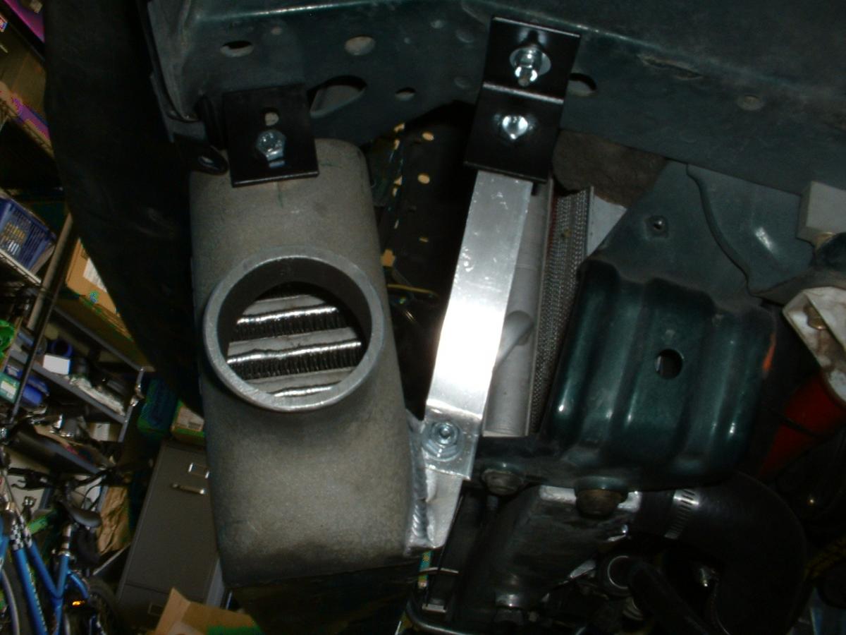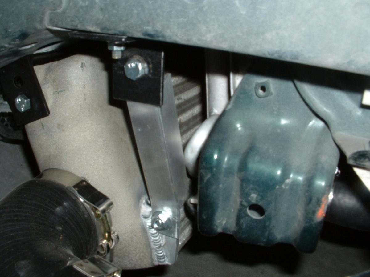Here's how I mounted the intercooler. I made four brackets out of angle iron and bolted it to the chassis. The front mounts use the mounting hole of the intercooler. I made brackets and had them welded to the lower part of the intercooler. I made supports out of angle aluminum and connected them to the lower brackets.