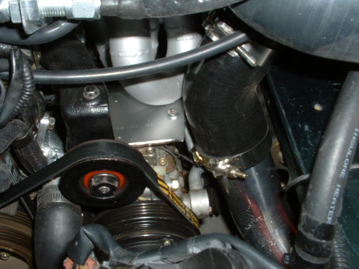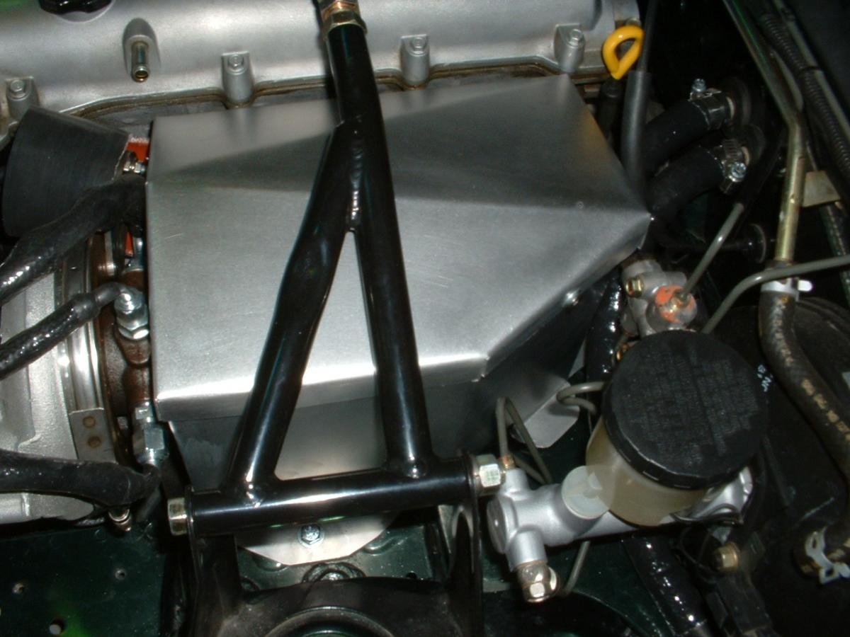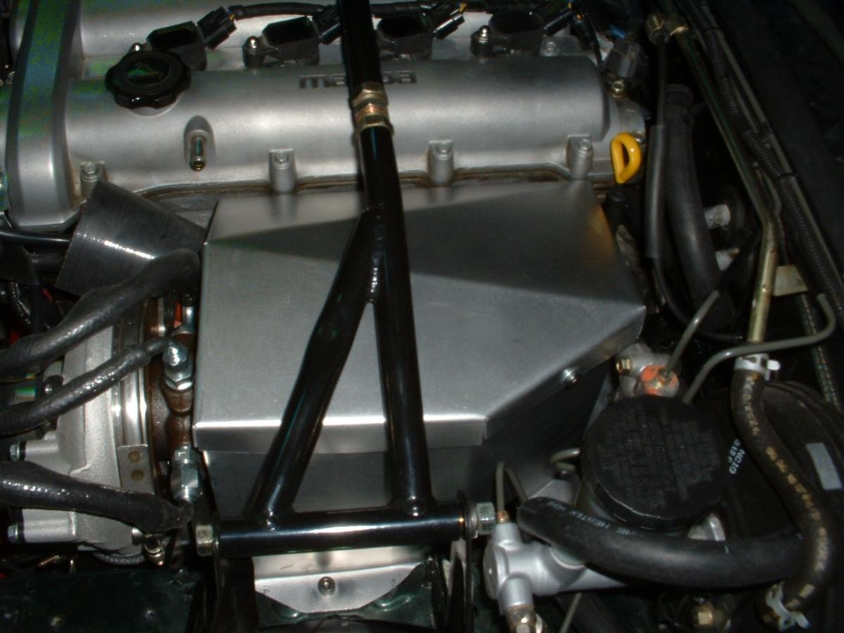 Here's how I mounted the intercooler. I made four brackets out of angle iron and bolted it to the chassis. The front mounts use the mounting hole of the intercooler. I made brackets and had them welded to the lower part of the intercooler. I made supports out of angle aluminum and connected them to the lower brackets.