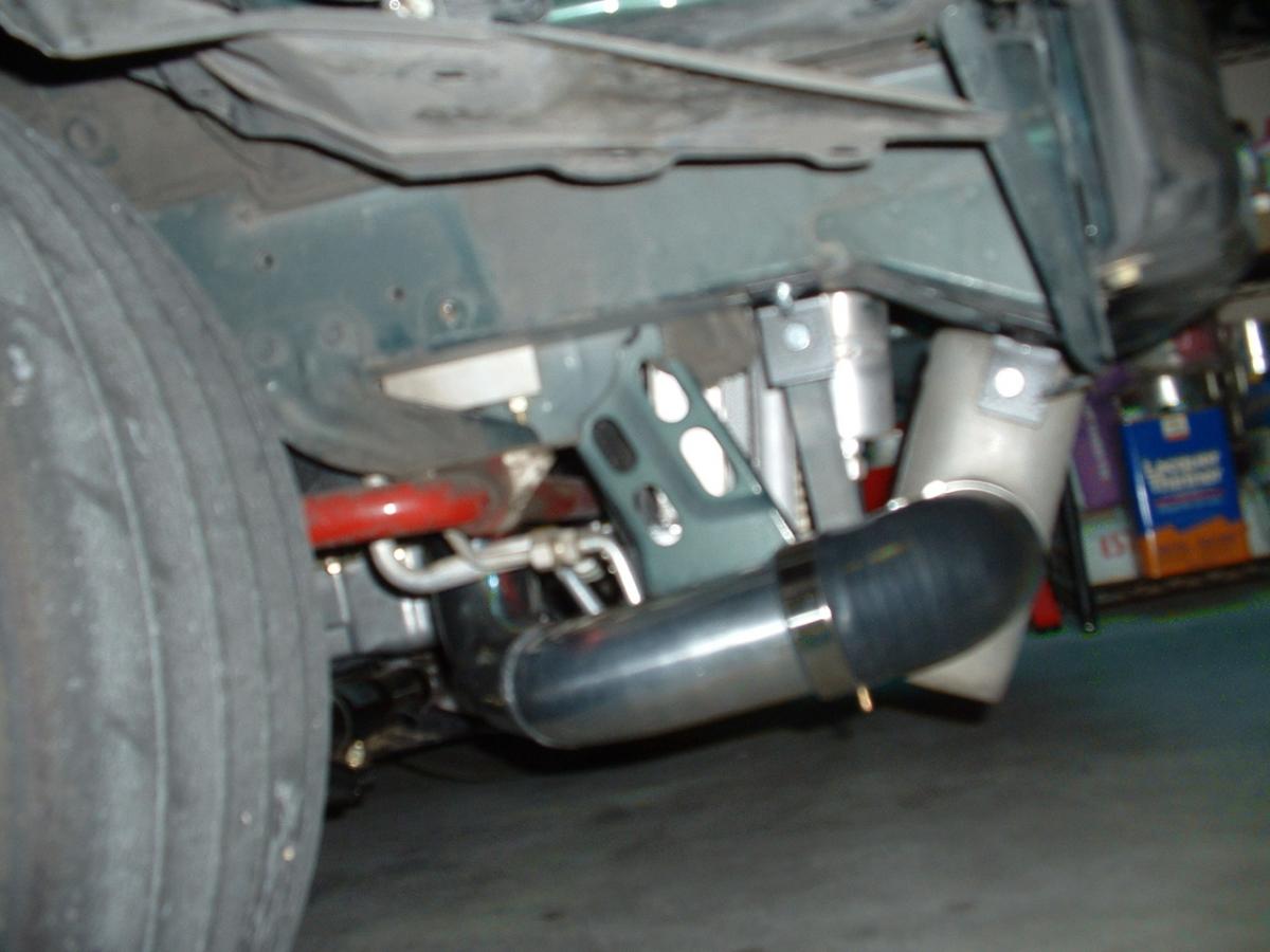 I will make an undertray to replace the original. I had to remove the bumper intake ducting and bumper liners to fit the intercooler and the charge pipes. The intercooler is positioned to clear the AC drier and bumper.
