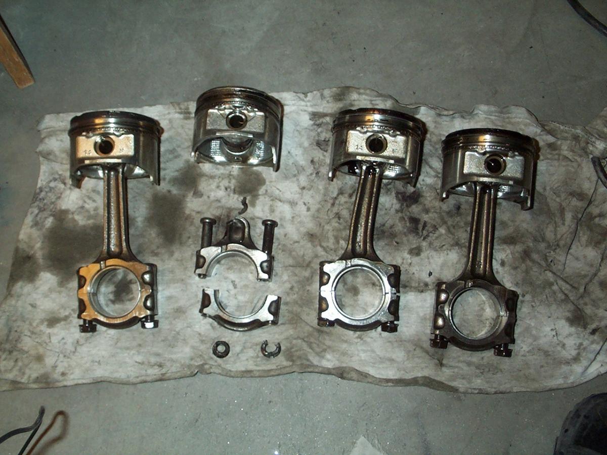 Good observation! It made me look twice. I realized in that pic, I haven't removed the oil pan at that point. I double checked the piston and rod and they are not twisted. It must be the reflection of the flash from the bore onto the piston. It you look closely at the bottom edge of the piston, you can see that the the relief cuts for the valves are lined up with the block. It also explains the bright part of the No 1 piston.