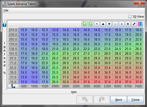 Here's my timing table... open to criticism as always. I'm guessing there's plenty of be gained in the low end from this as well- IIRC most miata spark tunes come with a low point around 4k, with more advance both below and above 4k. Mine's more or less flat-lined till 5k, then I start ramping up slowly.