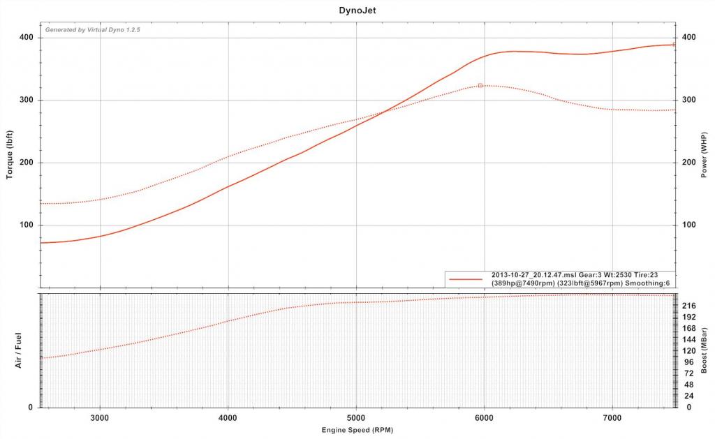 Here's a quick vdyno and crappy video of said pull from tonight (been messing around new camera...audio is terrible from the vibes). I started the pull at about 3k RPMs in 3rd gear, so this is also about worst case scenario as far as showing turbo spool potential. I hope VVT will improve it as well.
