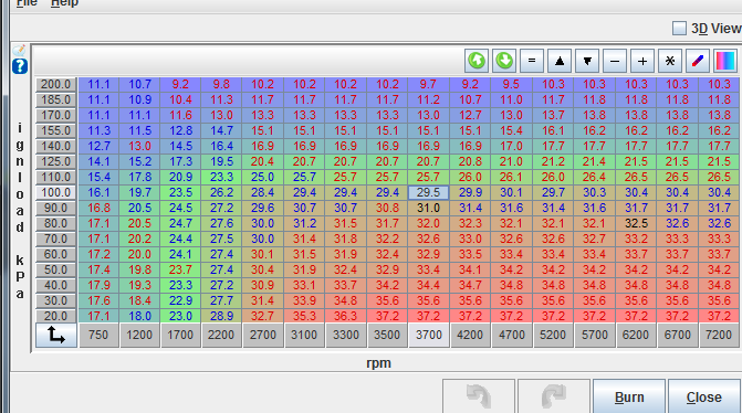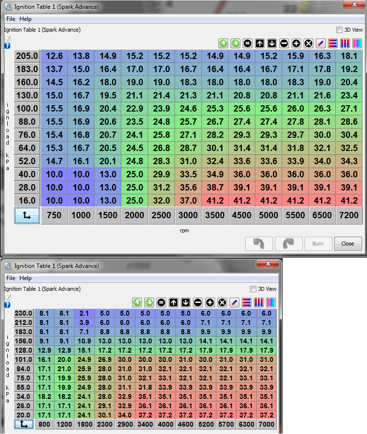 Here's what I was running, and what I loaded up at the gas station. Sorry they aren't binned the same, makes it hard to compare direct. I'd target 190kpa max, usually around 170, so I'm running half as much timing