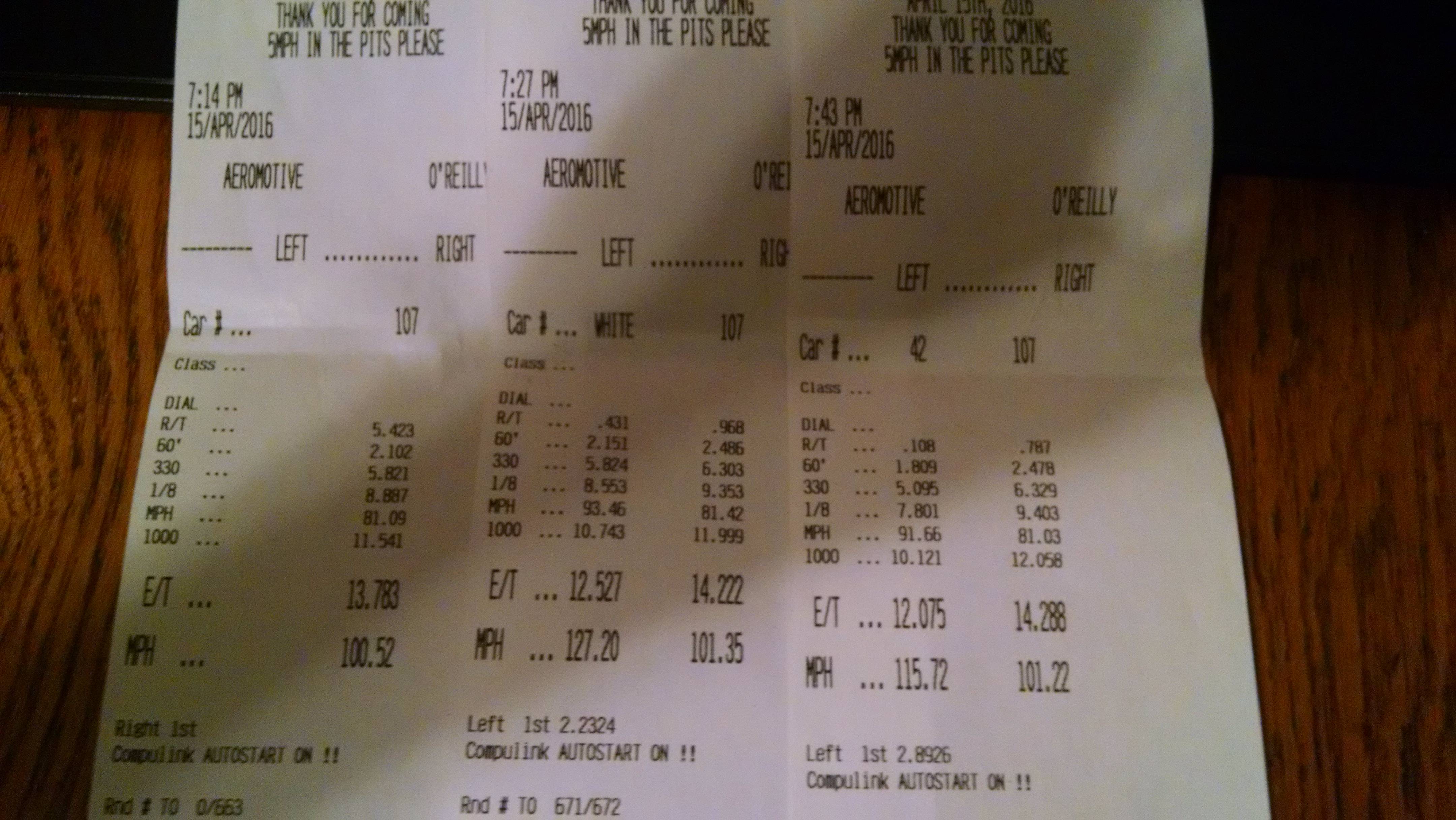 Went to the drag strip, running 14 pounds. I suck at launching my car, need more practice...
