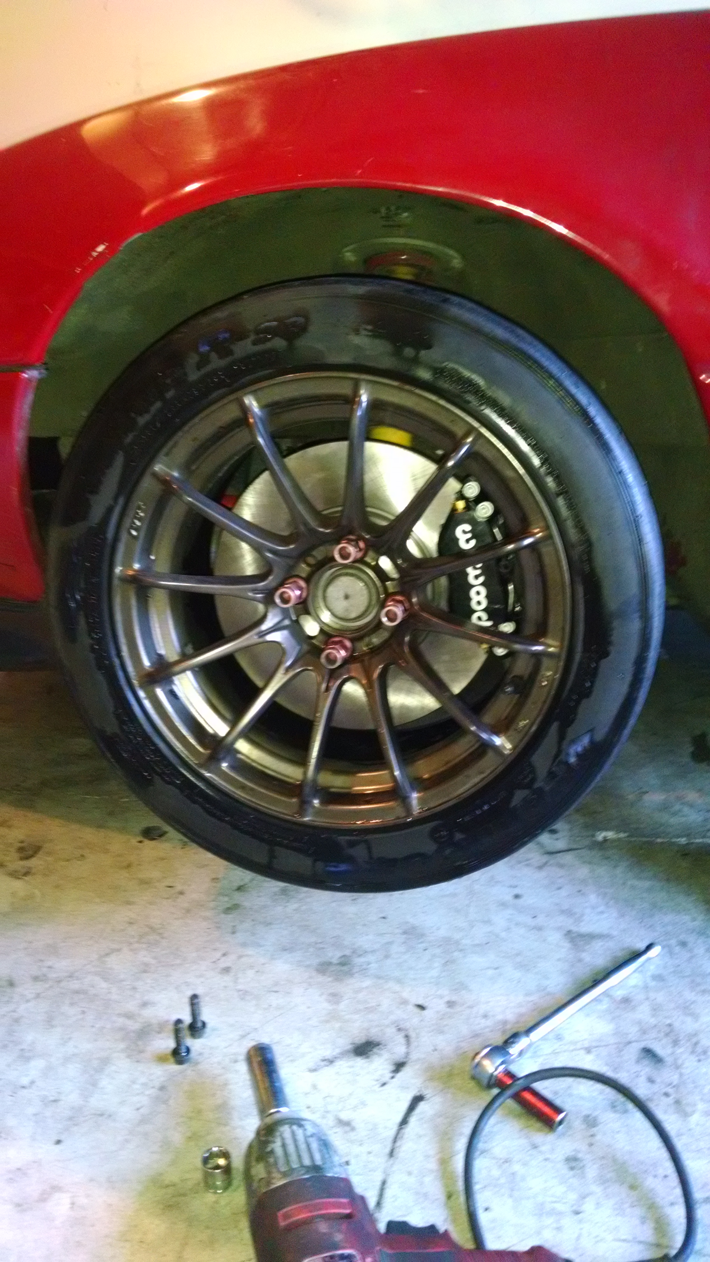<p></p><p>Fits. Again, about .245&quot; of clearance with the caliper sitting on the rotor. Spacers would probably increase that by another .25&quot;</p>
