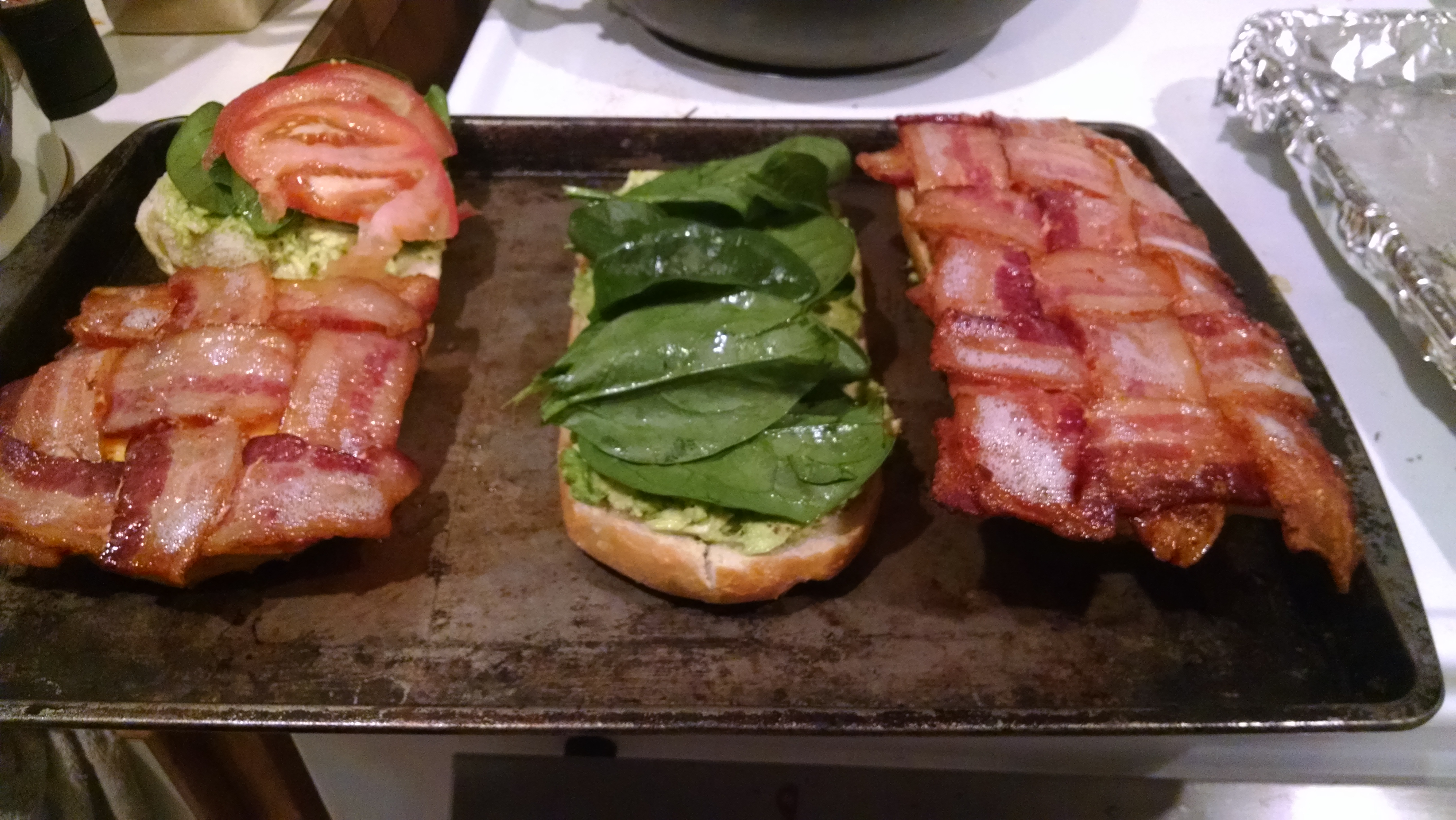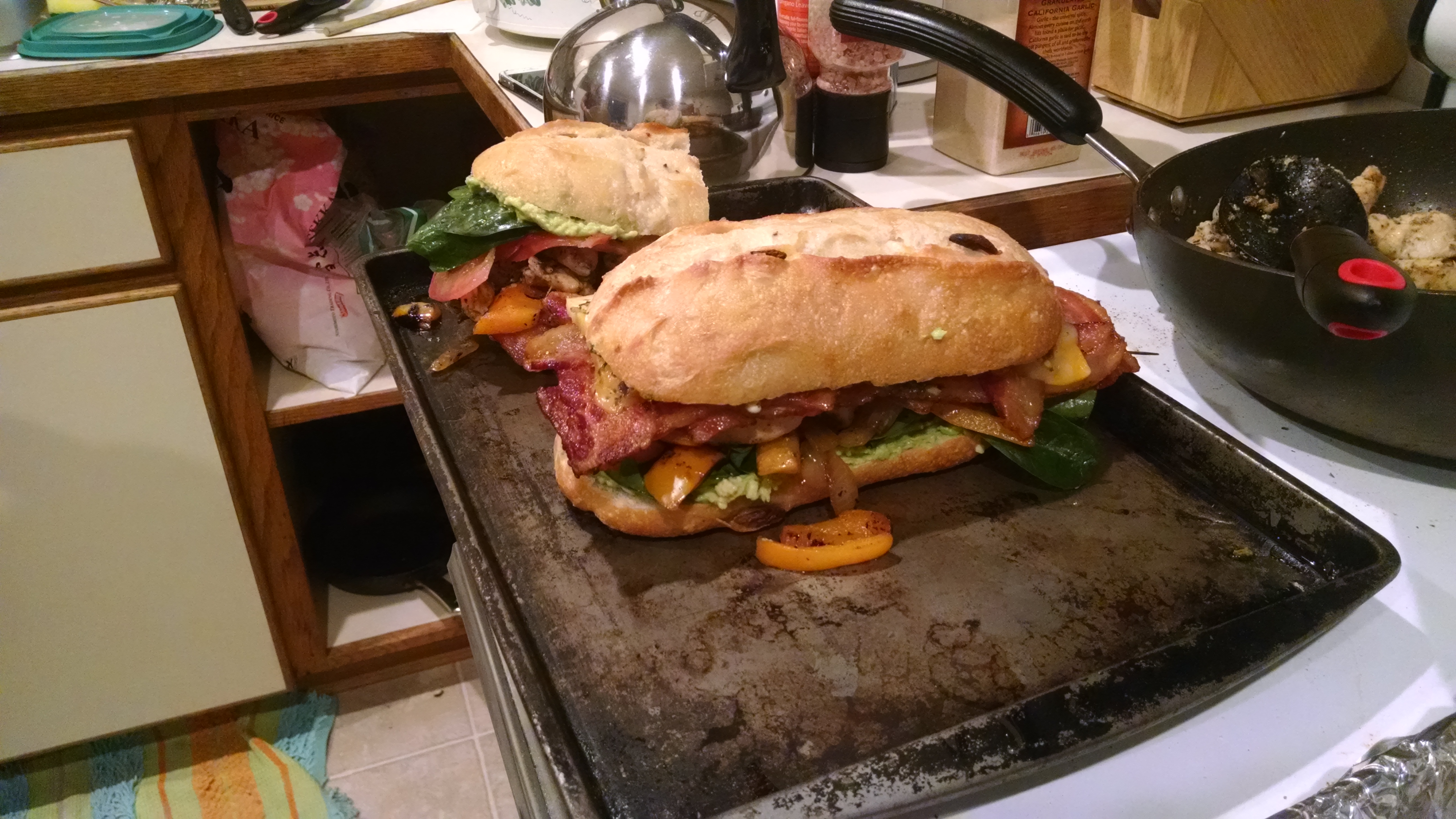Dinner was epic. Chicken panini with a bacon weave. Pesto, avocado, spinach, cheese and peppers.