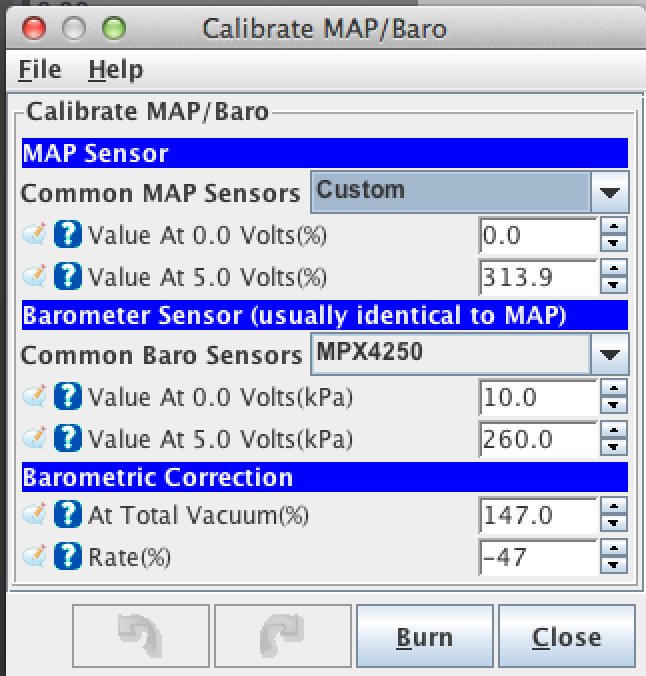 TK derived the custom calibration by hooking up all four sensors (builtin, GM, plus a couple of the mouser ones I bought for measuring back pressure) to the same line, data logging at various MAP values (mityvac is useful for this), and then massaging the data so that they line up. I don't know what the curve-fitting algorithm he used was.