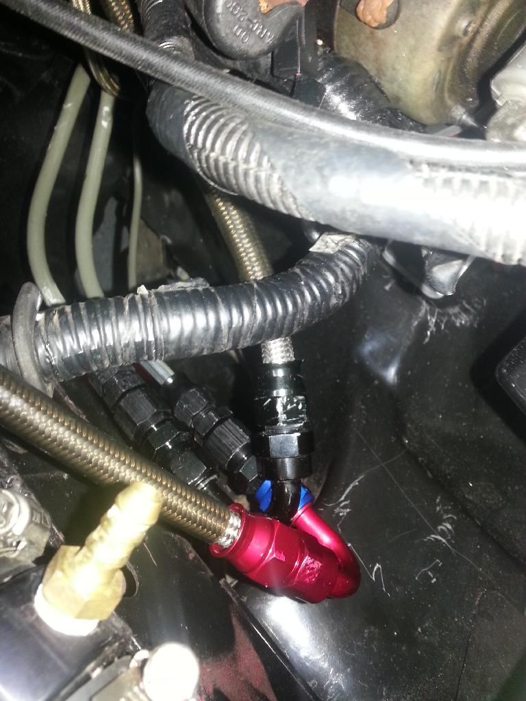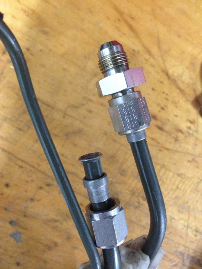 Dont do what I did. Those are the 50psi rated connections and its a pita to use. And I only ended up with the connections way the **** down there because I suck. What you want is a -5AN tube nut and ferrule, and a -5AN to -6AN male to male adapter, preferably stainless for all those parts, then you can go to aluminum hose ends or the pimping QD fittings. You're also going to need a flaring kit that can do -5AN.