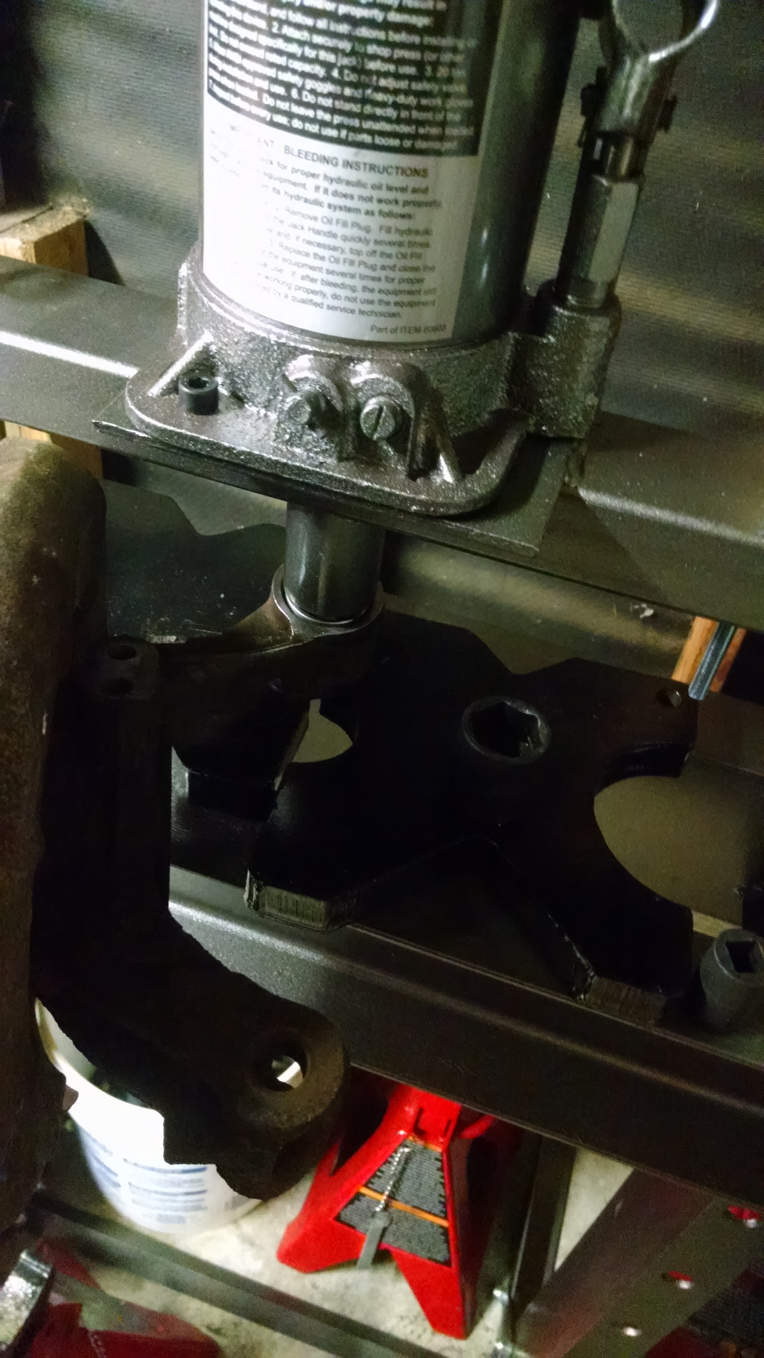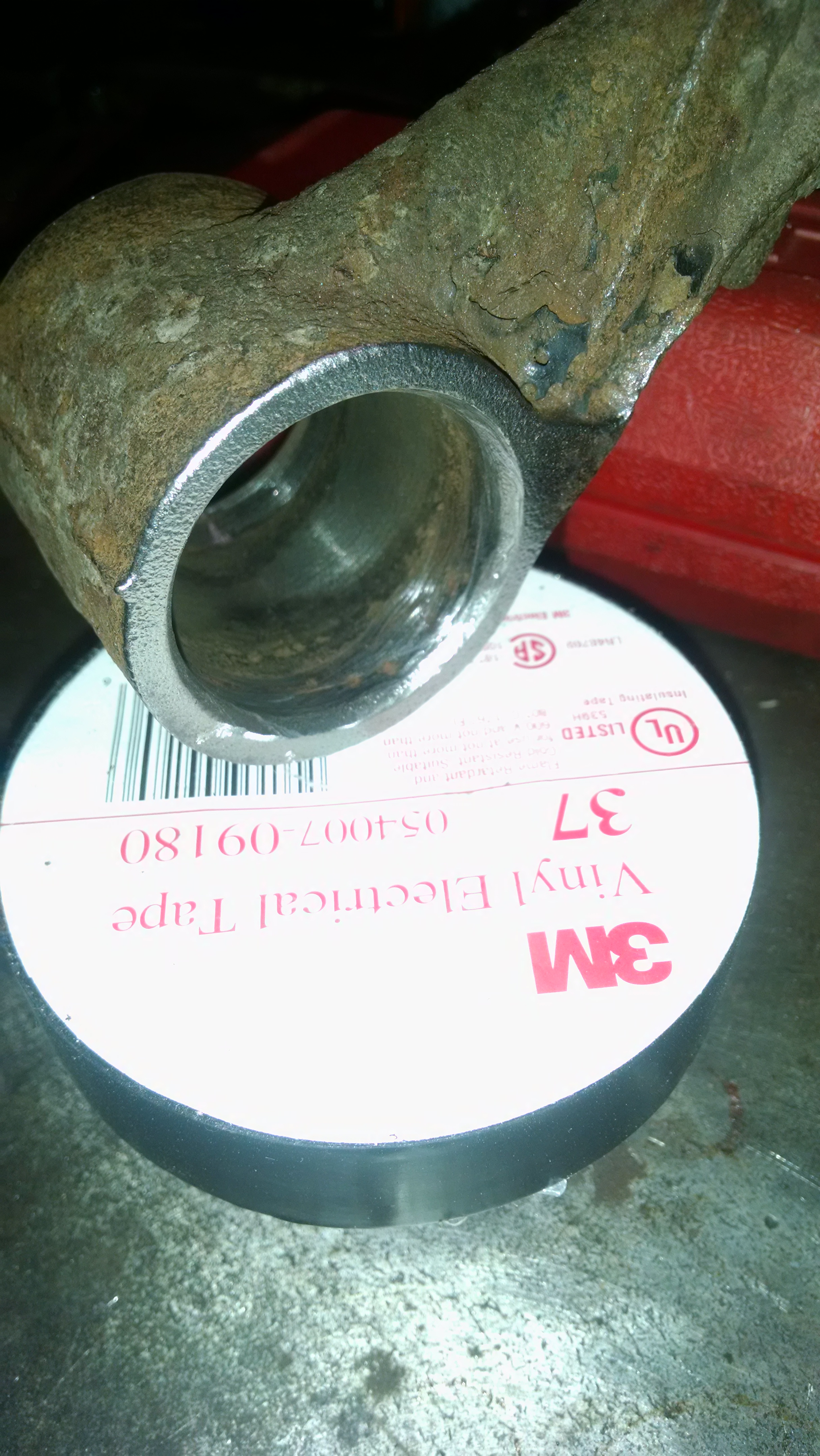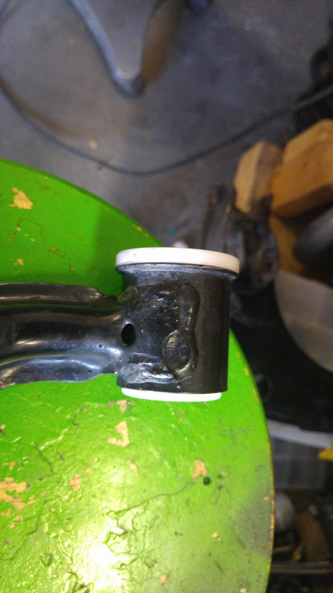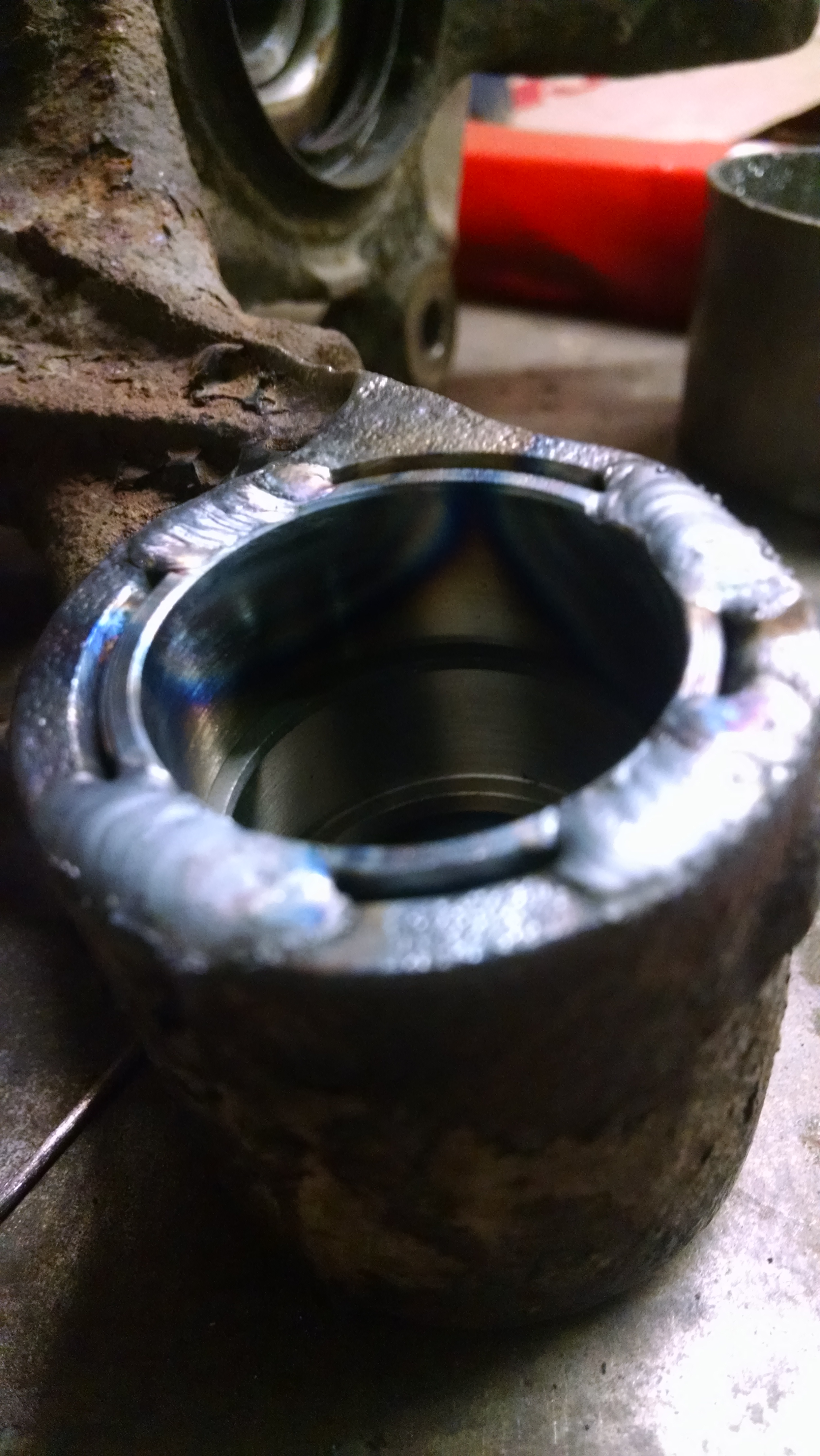 First step in the bushing replacement. Pressing out old bushing in the ABS spindles, and welding in the spherical sleeves. These will get powdercoated before they go on. **** midwest salt, this **** is ridiculous. I had to grind so much metal off just to get clean metal to weld to.
