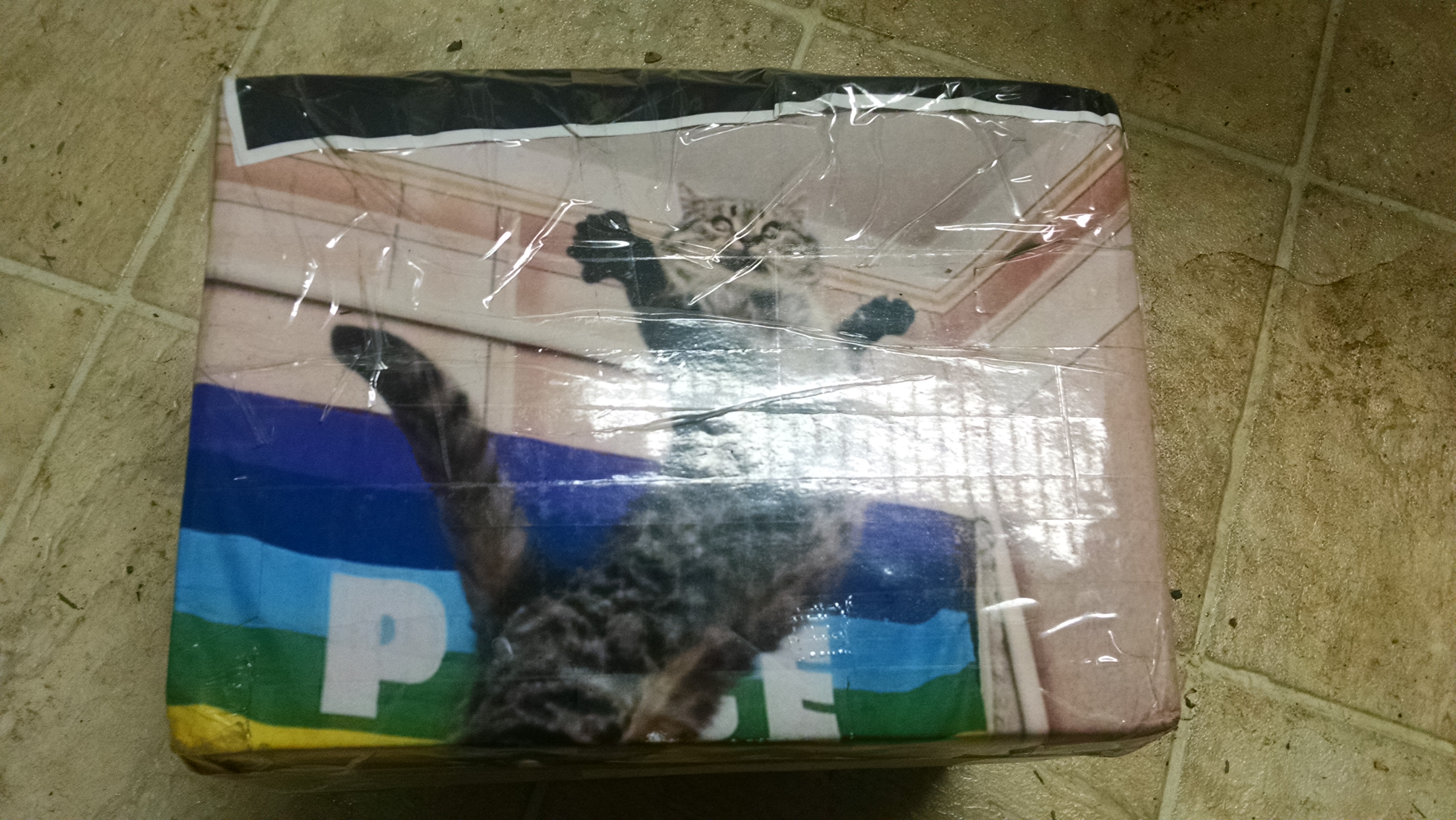 The panel with the rainbow cats is the top. After you cut along the long edges open from the red Cat side. Don't cut along the purple cat side.