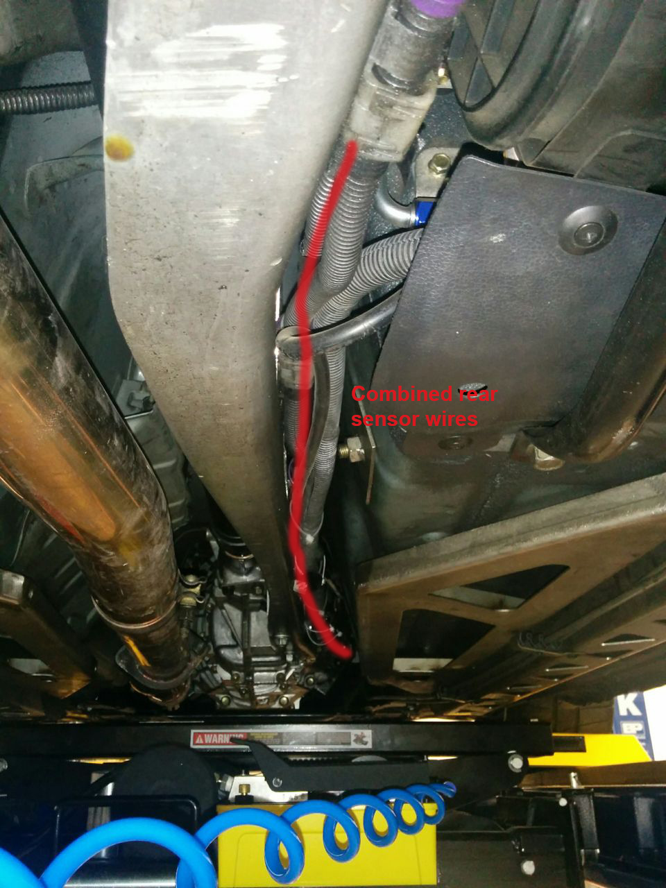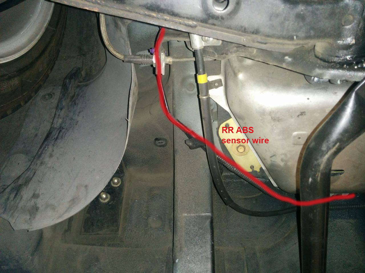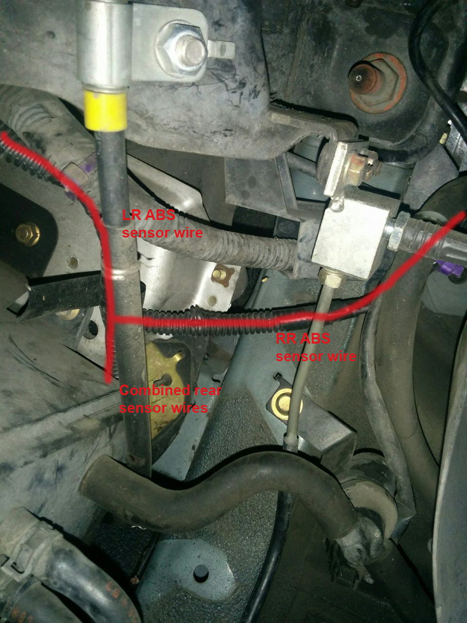 Basically the driver's side wire routes through the tunnel that the parking brake cables go through to get over to the passenger side, then joins up with the passenger side wire near the charcoal canister. They route behind that over to the center, then along the PPF to the front of the car, then up along the brake lines to the ABS unit.