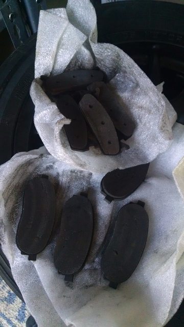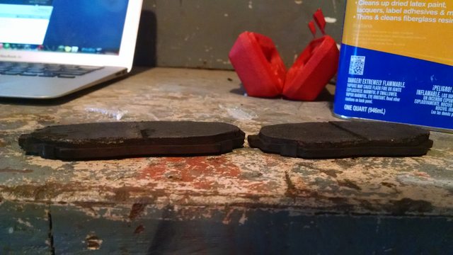 <p>Thick end at the trailing edge, so front of the caliper. Cobalts don't need hardware apparently, they just rattle around. More carnage to come.</p>