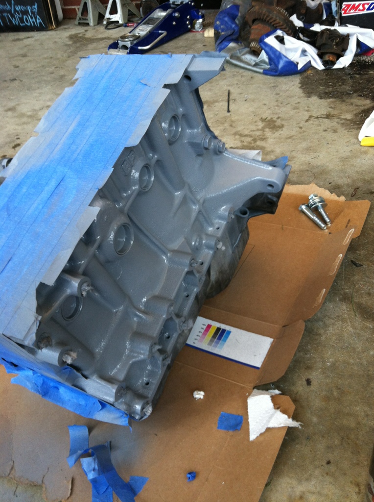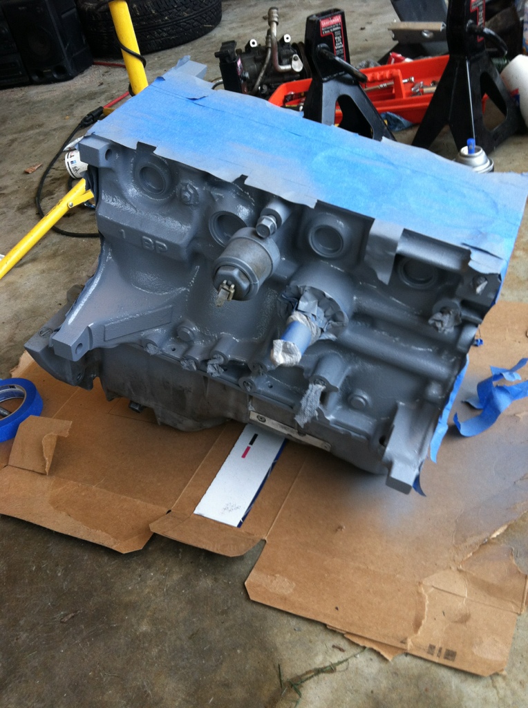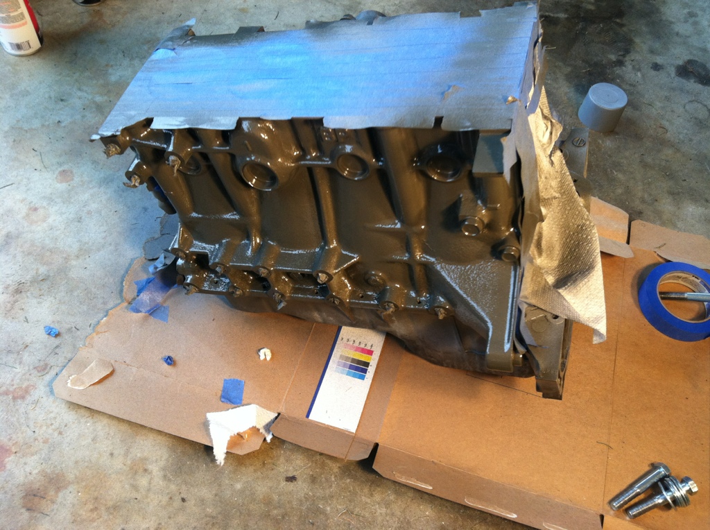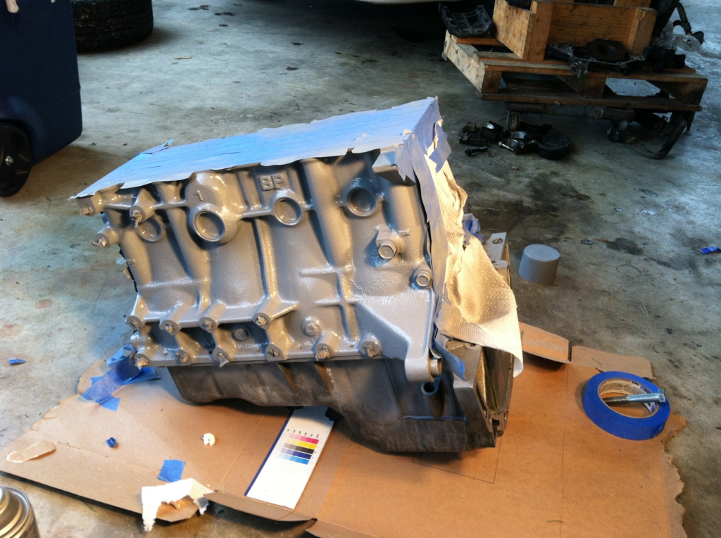 So I got it home and began preparing for assembly, started by painting the block. 3 stages (all high temp) primer, paint, and clear.