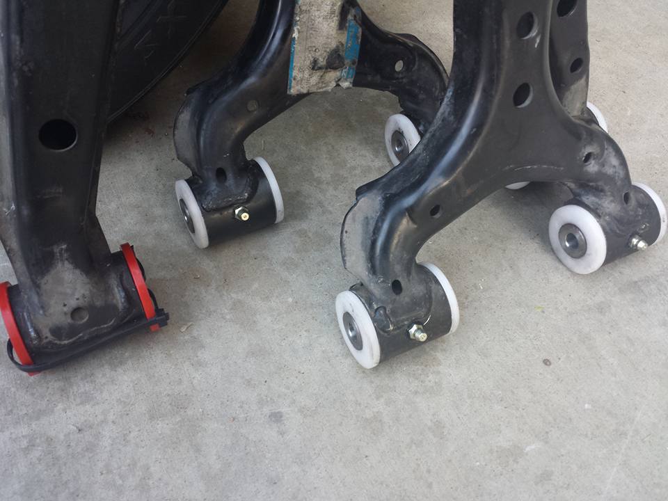 Last Saturday I went over to Sean's place and got all these put in. Went with the delrin kit with bronze bearing sleeves in the poly locations, grease fittings all around, delrin offset bushings in the forward position of the FLCA, and am staying with poly/bronze bushing in the RUCA outer position in order to not take points for NASA classing.