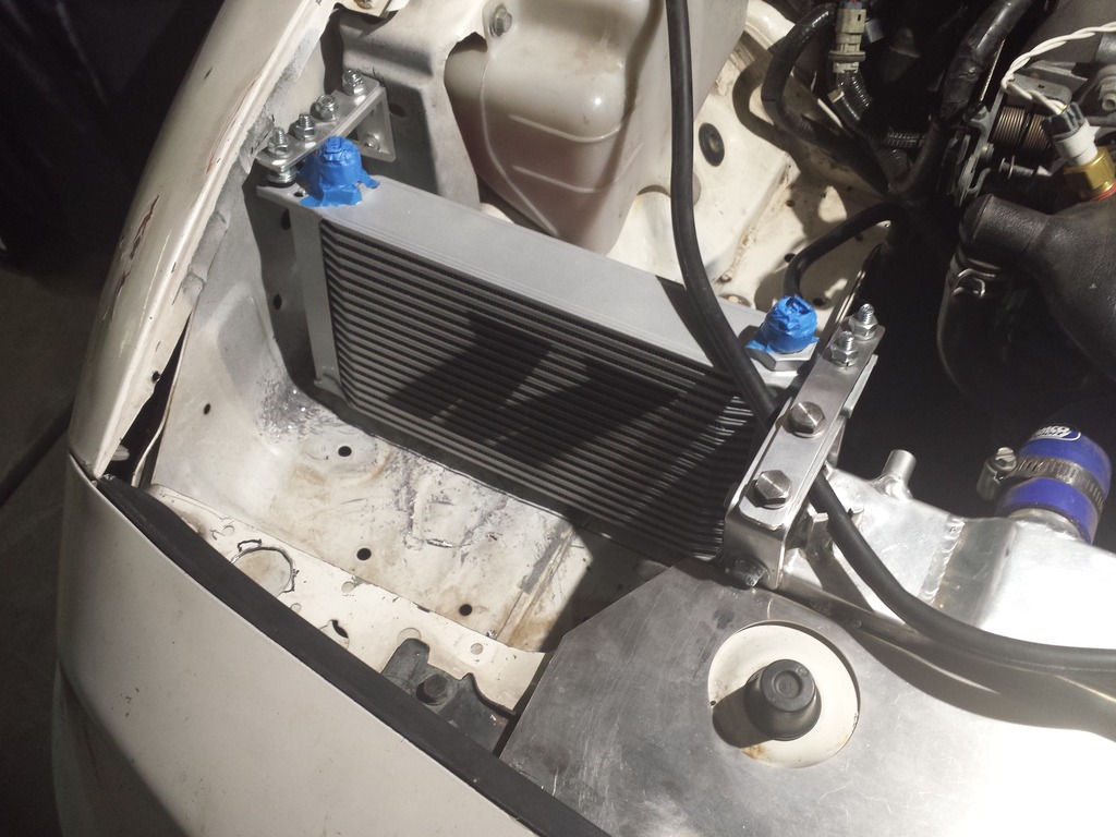 Used an assortment of nut serts, scrap aluminum, some titanium hardware and rubber grommets to mount the oil cooler. It's fully isolated but is still mounted in there very solid. Just need to make the AN lines and fab up a duct that connects to the front turn signal inlet.