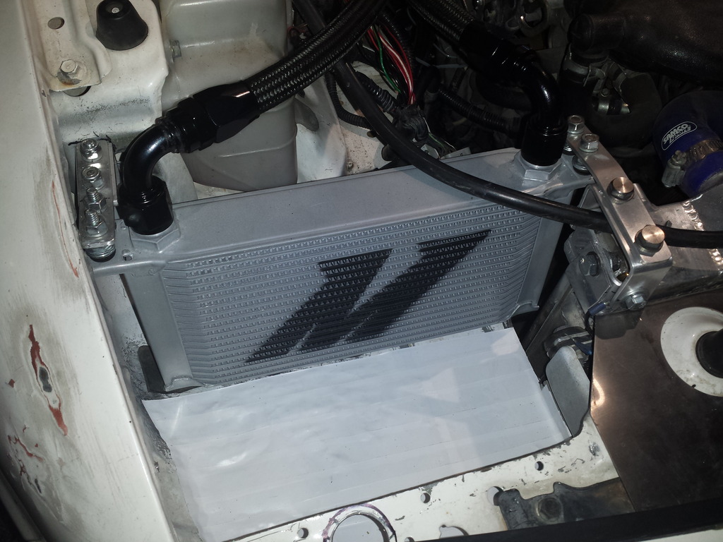The oil adapter octopus was not fun to get bolted up... just need to finish ducting the oil cooler and cleaning up some wiring for front lights in that corner that is being redone.