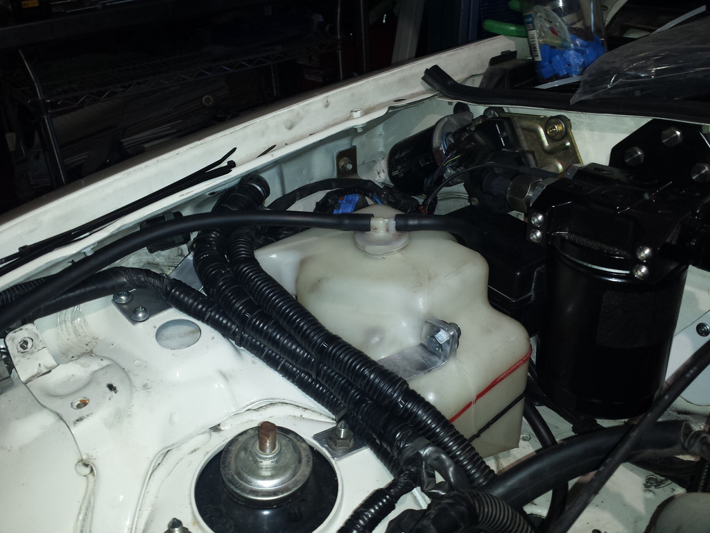Decided to relocate the radiator overflow tank. Made some quick custom brackets and that side of the engine bay is much cleaner. Now the hot air from the oil cooler has a clear path to the hood vent, so hopefully it will increase flow but who knows.