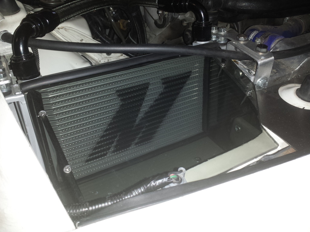 My dad got the ducting finished up for the oil cooler. Same plexi that the airbox is made out of. Used heater hose on the edges to seal to the cooler and so that the plexi doesn't melt. It's pretty much sealed to the front turn signal opening, turned out pretty good.