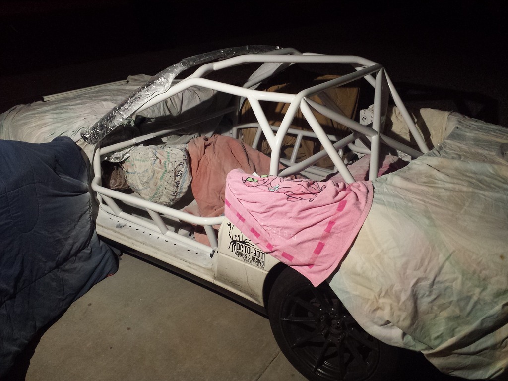 New glass is going in tomorrow morning. Before the rest of the cage I still needed half a tank of gas to meet minimum weight. I've gutted the dash structure and switched from 245 RC1 to 205 R7, and cut out the previous door bars, so probably near 40lbs of weight reduction, then added in the weight of the front half of the cage, safety nets, cutoff switch/wiring, and bigger fire extinguisher.