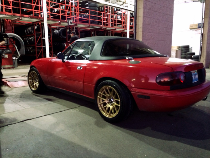 It's been a minute, time for an update. I bought a 95' Miata with 140k with a hardtop, 95 mitata link ECU, AEM Uego controller, racing beat full header back pipe, TEIN flex coilovers, 4k conversion headlights and other stuff as well for $2000 so i could take all the fixin's and then sell it. My best friend is lined up to buy it when he comes up for the holidays. I already got the exhaust on my car and it sounds awesome! I think i'm going to trade him my bilstein sport/eibachs/ground control set up for the TEIN flexe's on his car. I liked the way it felt when i drove it home to take it apart. A bit softer, more street friendly i'd say. Well here is a couple pictures with the hard top on and what not. Also i got most of the maintenence stuff out of the way as well such as AMSOIL in the tranny and diff, fuel filter, fresh NGK plugs and wires and fresh tires to burn up