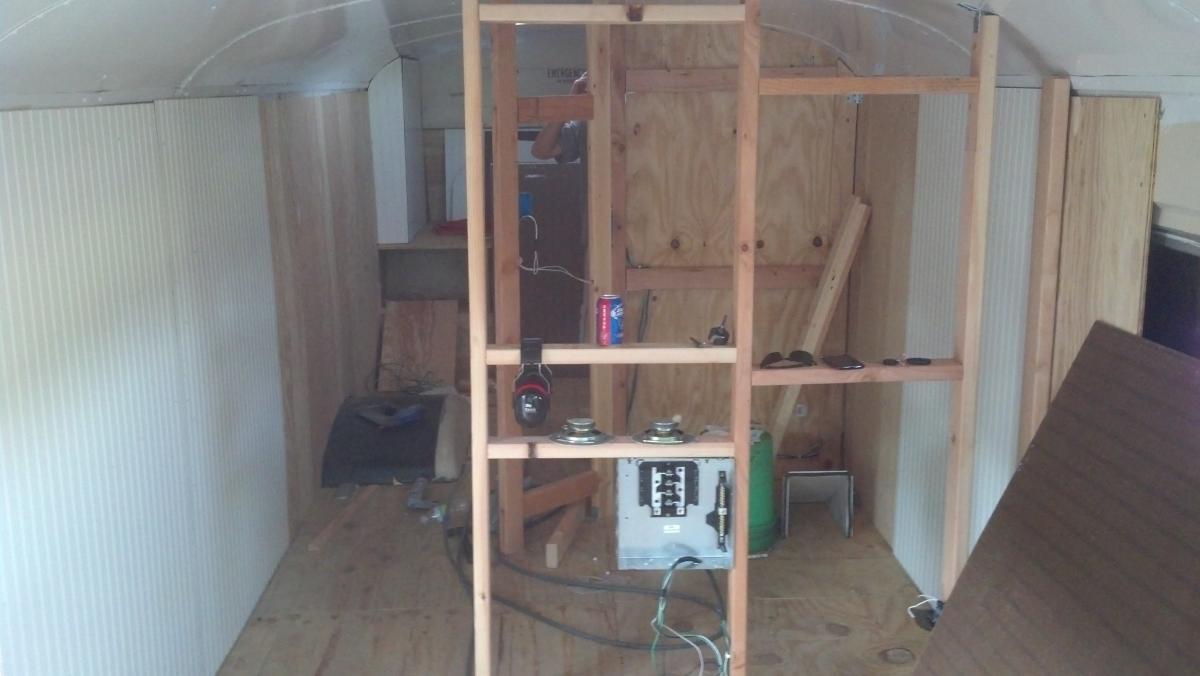 The back of the bus is the bedroom and the middle part is the bathroom. you can see the framing for the walls here: