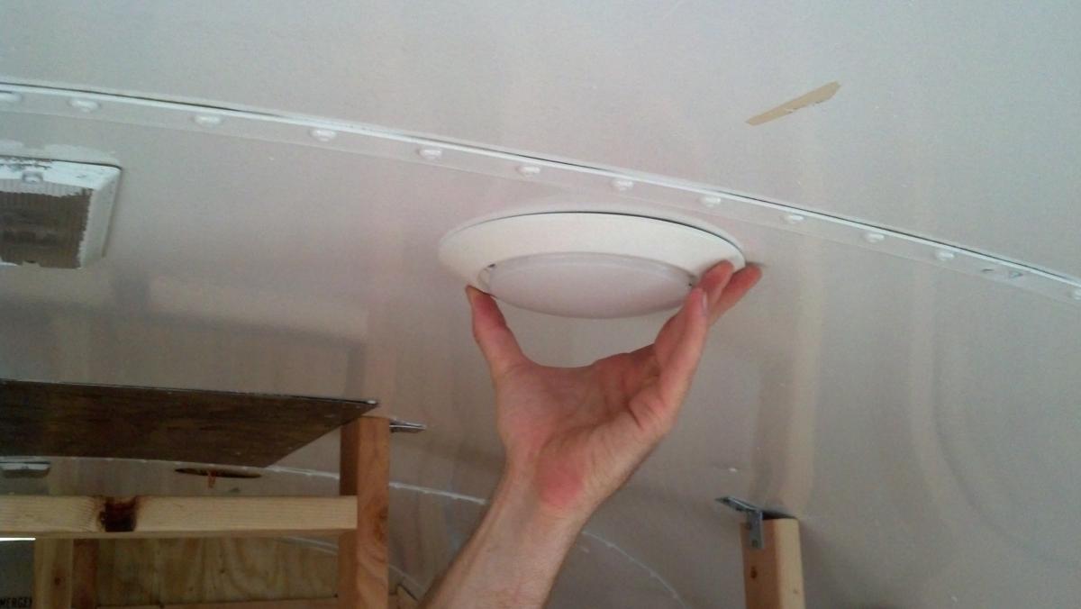 We were stoked to find an overhead lighting fixture that would fit in the ceiling. There is only about 2" to work with up there, so this is our only option. In our old bus all of the lighting had to come from the side, which isn't really that big of a deal, but these fit the bill quite well.