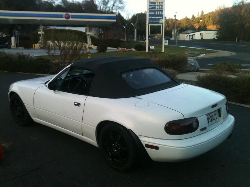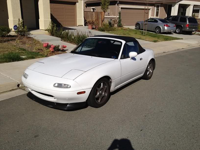 I'm from Sonora, Ca in the foothills of the Sierra Nevada's, where the majority of the roads are windy and curvy as hell. I've had some fun driving it around, but had a run in with a family of deer the other night. Ended up on the shoulder which had a manzanita tree and some rocks that the Miata and I wiped out. Broken and bent some stuff, the front right tire is stuck turned toward the right. So I flat bedded it to my house and it's damage assessment time.