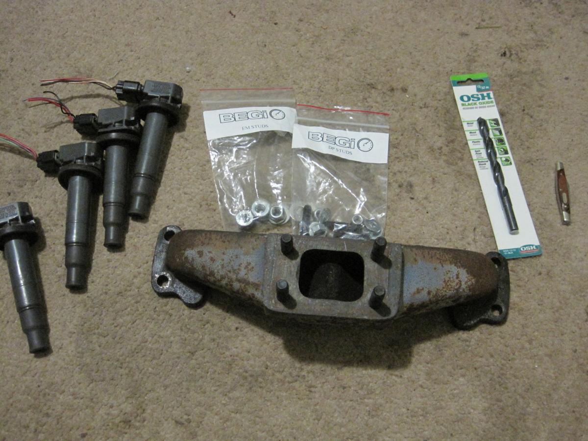 Pictured: rebuilt SR20 T25, Begi cast manifold, ceramic coated FM divorced waste gate divider cast elbow, FM 2.5 hybrid downpipe with brace, brain-built MS1. Planning on either picking up the rest of the FM exhaust setup from MCA or having a buddy build me 2.5" from the downpipe back with a big magnaflow.