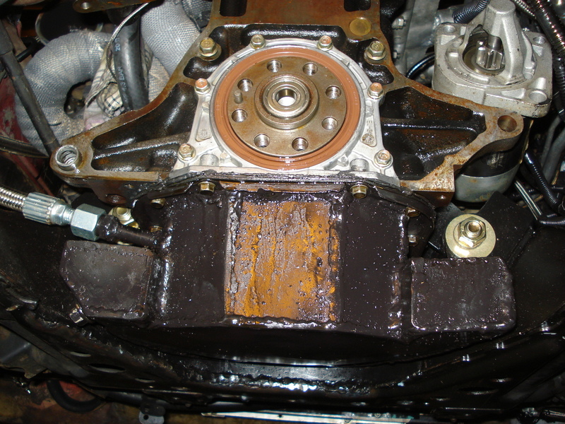 Now days im doing it in 3.5 hours by myself.)I found 3 super tiny leaks in the pan itself (if it were only these i wouldn't worry about it they are so small.) but i determined the majority is coming from the lower oil pan gasket. Since the face of the pan was warped some due to thermal shrinking during the welding process so the face of the pan and windage tray don't mate up perfectly. My desperate solution was to clean it up the best i could with starter fluid and then go crazy with some gasket maker. From previous experiences success is hit and miss but i don't have the resources or space to pull the engine and fix it the right way right now. Plans for a new pan / dry sump oil system exist but are further down the road.