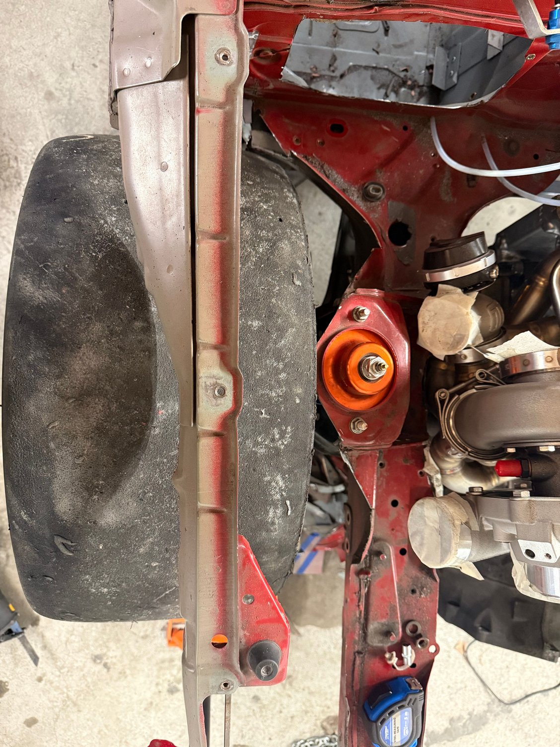 For the most part it's not too bad. Gotta cut out the tub, but that's easy. The biggest issues are cutting the area behind the tire, and the clearance to the shock tower. The area near the firewall has several layers, and it's a massive pita to cut. I was trying to not remove more than necessary, but will eventually trim a little bit more for aero reasons. As for the shock towers, I'm test fitting with Konig Hypergrams 18x10.5 et25 and 280/650-18 Yokohama A005s. Even after cutting flush with the shock top hat it was still too tight, so I added 10mm spacers. Now it clears in bump, but still makes contact when turning. I destroyed my ball joints when swapping the uprights, so everything has been fairly loose, which is obviously not good for these measurements, so I ordered a front-end service kit from Supermiata, and while I wait for it to make its way across the pond I moved to the rear. When that gets here I can do the final trimming, then I'll plate it all back up as well as tie the shock towers to the roll cage.